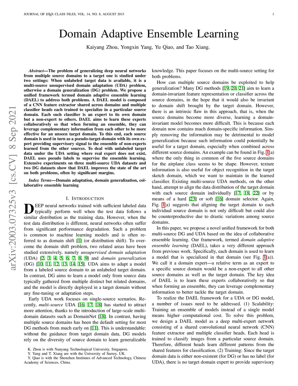 The problem of generalizing deep neural networks from multiple source domains to a target one is studied under two settings: When unlabeled target data is available, it is a multi-source unsupervised domain adaptation (UDA) problem, otherwise a domain generalization (DG) problem. We propose a unified framework termed domain adaptive ensemble learning (DAEL) to address both problems. A DAEL model is composed of a CNN feature extractor shared across domains and multiple classifier heads each trained to specialize in a particular source domain. Each such classifier is an expert to its own domain and a non-expert to others. DAEL aims to learn these experts collaboratively so that when forming an ensemble, they can leverage complementary information from each other to be more effective for an unseen target domain. To this end, each source domain is used in turn as a pseudo-target-domain with its own expert providing supervisory signal to the ensemble of non-experts learned from the other sources. For unlabeled target data under the UDA setting where real expert does not exist, DAEL uses pseudo-label to supervise the ensemble learning. Extensive experiments on three multi-source UDA datasets and two DG datasets show that DAEL improves the state of the art on both problems, often by significant margins. The code is released at \url{https://github.com/KaiyangZhou/Dassl.pytorch}.