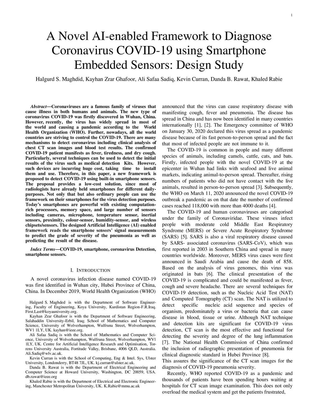Coronaviruses are a famous family of viruses that cause illness in both humans and animals. The new type of coronavirus COVID-19 was firstly discovered in Wuhan, China. However, recently, the virus has widely spread in most of the world and causing a pandemic according to the World Health Organization (WHO). Further, nowadays, all the world countries are striving to control the COVID-19. There are many mechanisms to detect coronavirus including clinical analysis of chest CT scan images and blood test results. The confirmed COVID-19 patient manifests as fever, tiredness, and dry cough. Particularly, several techniques can be used to detect the initial results of the virus such as medical detection Kits. However, such devices are incurring huge cost, taking time to install them and use. Therefore, in this paper, a new framework is proposed to detect COVID-19 using built-in smartphone sensors. The proposal provides a low-cost solution, since most of radiologists have already held smartphones for different daily-purposes. Not only that but also ordinary people can use the framework on their smartphones for the virus detection purposes. Nowadays Smartphones are powerful with existing computation-rich processors, memory space, and large number of sensors including cameras, microphone, temperature sensor, inertial sensors, proximity, colour-sensor, humidity-sensor, and wireless chipsets/sensors. The designed Artificial Intelligence (AI) enabled framework reads the smartphone sensors signal measurements to predict the grade of severity of the pneumonia as well as predicting the result of the disease.