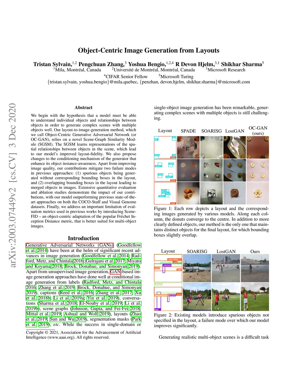Despite recent impressive results on single-object and single-domain image generation, the generation of complex scenes with multiple objects remains challenging. In this paper, we start with the idea that a model must be able to understand individual objects and relationships between objects in order to generate complex scenes well. Our layout-to-image-generation method, which we call Object-Centric Generative Adversarial Network (or OC-GAN), relies on a novel Scene-Graph Similarity Module (SGSM). The SGSM learns representations of the spatial relationships between objects in the scene, which lead to our model's improved layout-fidelity. We also propose changes to the conditioning mechanism of the generator that enhance its object instance-awareness. Apart from improving image quality, our contributions mitigate two failure modes in previous approaches: (1) spurious objects being generated without corresponding bounding boxes in the layout, and (2) overlapping bounding boxes in the layout leading to merged objects in images. Extensive quantitative evaluation and ablation studies demonstrate the impact of our contributions, with our model outperforming previous state-of-the-art approaches on both the COCO-Stuff and Visual Genome datasets. Finally, we address an important limitation of evaluation metrics used in previous works by introducing SceneFID -- an object-centric adaptation of the popular Fr{\é}chet Inception Distance metric, that is better suited for multi-object images.
