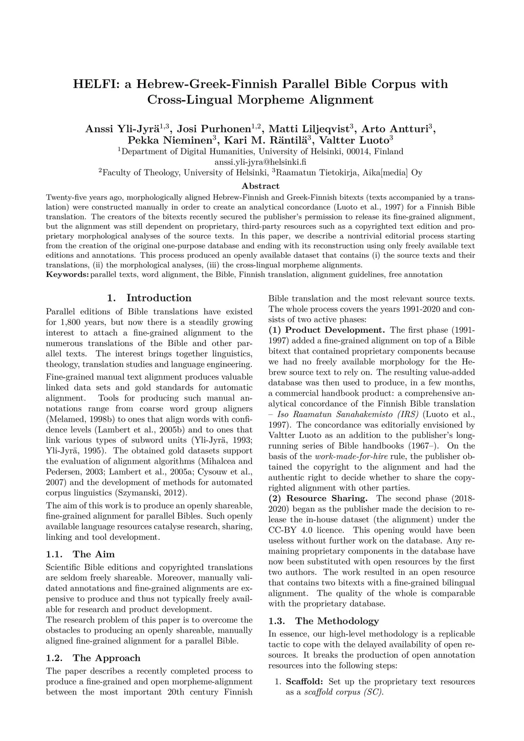 Twenty-five years ago, morphologically aligned Hebrew-Finnish and Greek-Finnish bitexts (texts accompanied by a translation) were constructed manually in order to create an analytical concordance (Luoto et al., 1997) for a Finnish Bible translation. The creators of the bitexts recently secured the publisher's permission to release its fine-grained alignment, but the alignment was still dependent on proprietary, third-party resources such as a copyrighted text edition and proprietary morphological analyses of the source texts. In this paper, we describe a nontrivial editorial process starting from the creation of the original one-purpose database and ending with its reconstruction using only freely available text editions and annotations. This process produced an openly available dataset that contains (i) the source texts and their translations, (ii) the morphological analyses, (iii) the cross-lingual morpheme alignments.