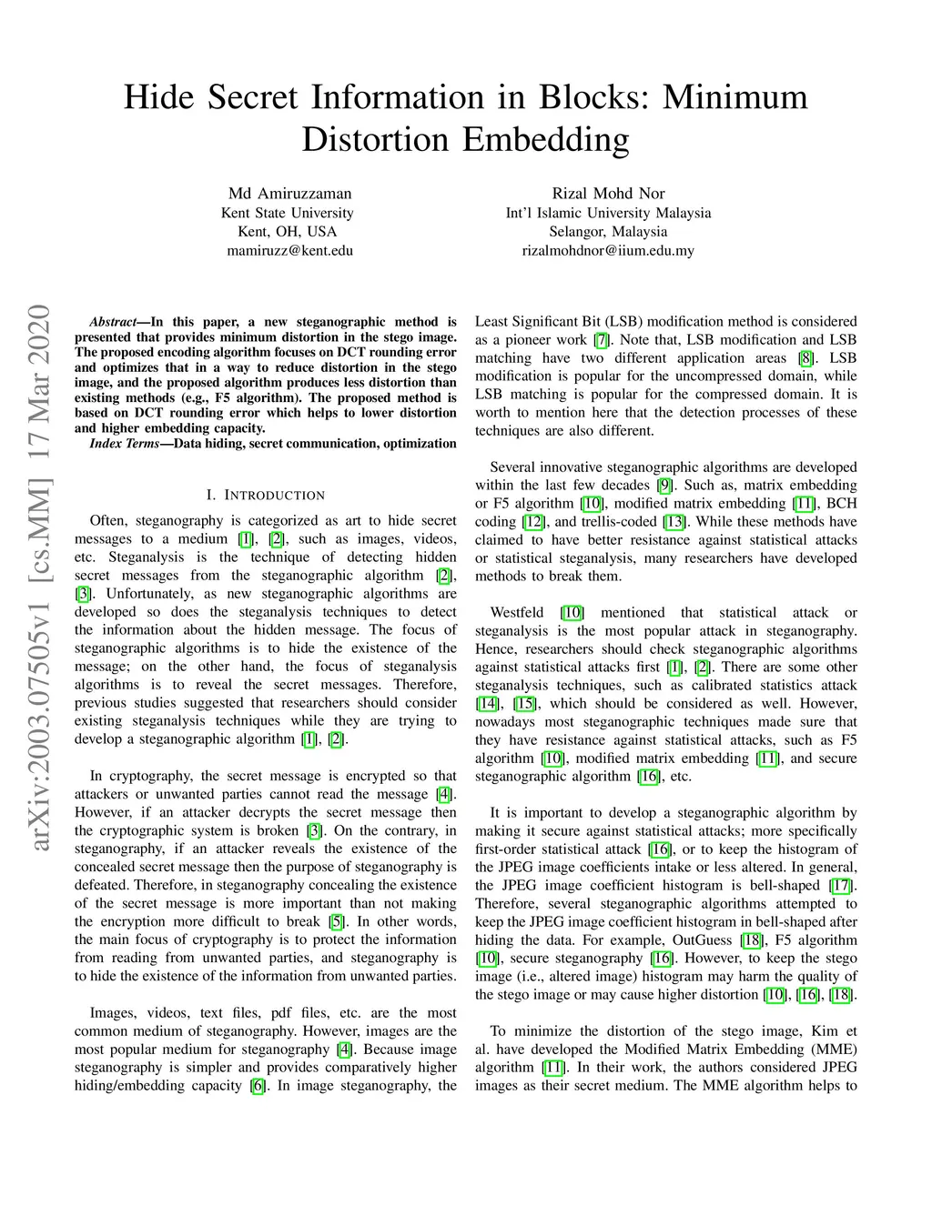 Hide Secret Information in Blocks: Minimum Distortion Embedding