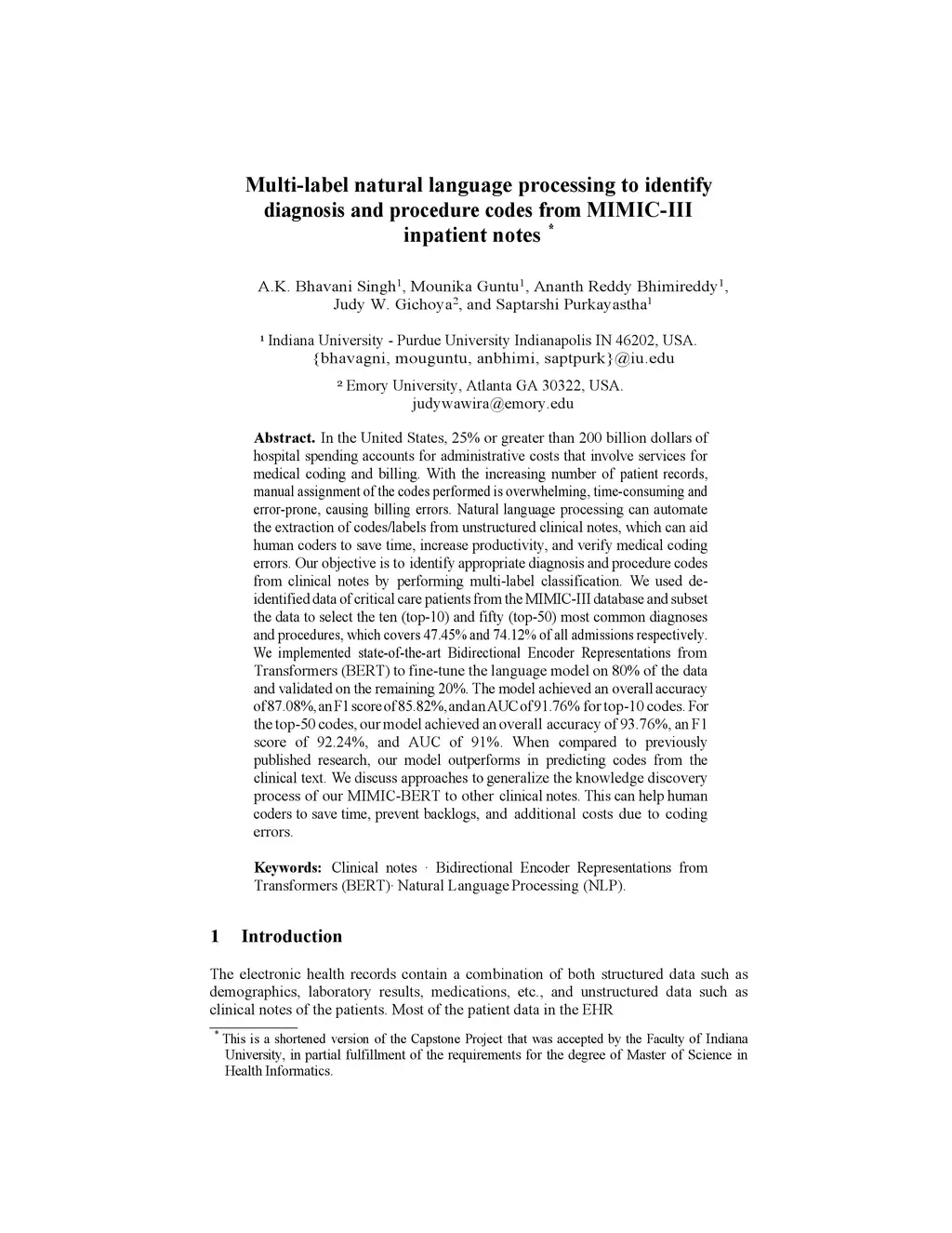 In the United States, 25% or greater than 200 billion dollars of hospital spending accounts for administrative costs that involve services for medical coding and billing. With the increasing number of patient records, manual assignment of the codes performed is overwhelming, time-consuming and error-prone, causing billing errors. Natural language processing can automate the extraction of codes/labels from unstructured clinical notes, which can aid human coders to save time, increase productivity, and verify medical coding errors. Our objective is to identify appropriate diagnosis and procedure codes from clinical notes by performing multi-label classification. We used de-identified data of critical care patients from the MIMIC-III database and subset the data to select the ten (top-10) and fifty (top-50) most common diagnoses and procedures, which covers 47.45% and 74.12% of all admissions respectively. We implemented state-of-the-art Bidirectional Encoder Representations from Transformers (BERT) to fine-tune the language model on 80% of the data and validated on the remaining 20%. The model achieved an overall accuracy of 87.08%, an F1 score of 85.82%, and an AUC of 91.76% for top-10 codes. For the top-50 codes, our model achieved an overall accuracy of 93.76%, an F1 score of 92.24%, and AUC of 91%. When compared to previously published research, our model outperforms in predicting codes from the clinical text. We discuss approaches to generalize the knowledge discovery process of our MIMIC-BERT to other clinical notes. This can help human coders to save time, prevent backlogs, and additional costs due to coding errors.