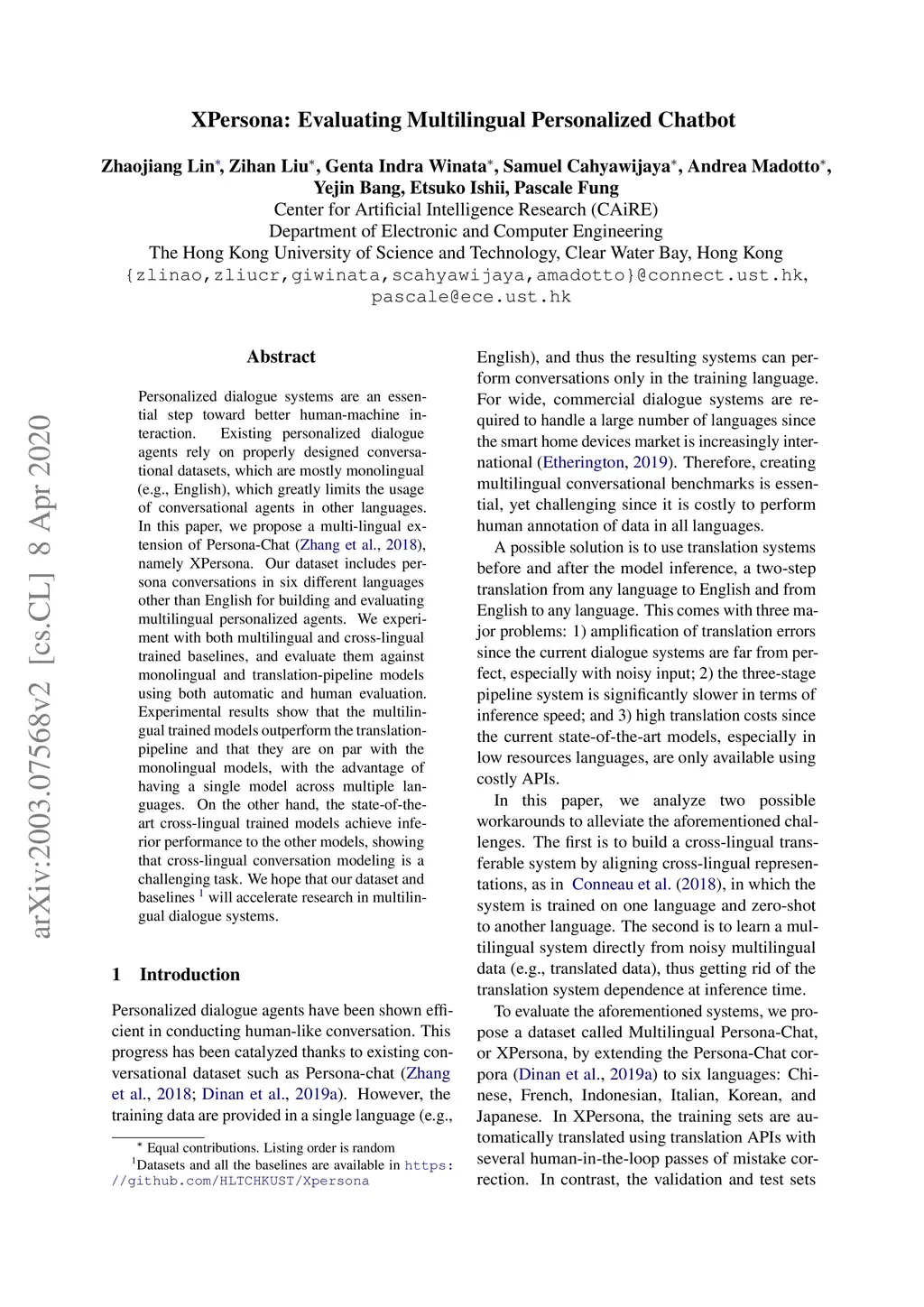 Personalized dialogue systems are an essential step toward better human-machine interaction. Existing personalized dialogue agents rely on properly designed conversational datasets, which are mostly monolingual (e.g., English), which greatly limits the usage of conversational agents in other languages. In this paper, we propose a multi-lingual extension of Persona-Chat, namely XPersona. Our dataset includes persona conversations in six different languages other than English for building and evaluating multilingual personalized agents. We experiment with both multilingual and cross-lingual trained baselines, and evaluate them against monolingual and translation-pipeline models using both automatic and human evaluation. Experimental results show that the multilingual trained models outperform the translation-pipeline and that they are on par with the monolingual models, with the advantage of having a single model across multiple languages. On the other hand, the state-of-the-art cross-lingual trained models achieve inferior performance to the other models, showing that cross-lingual conversation modeling is a challenging task. We hope that our dataset and baselines will accelerate research in multilingual dialogue systems.