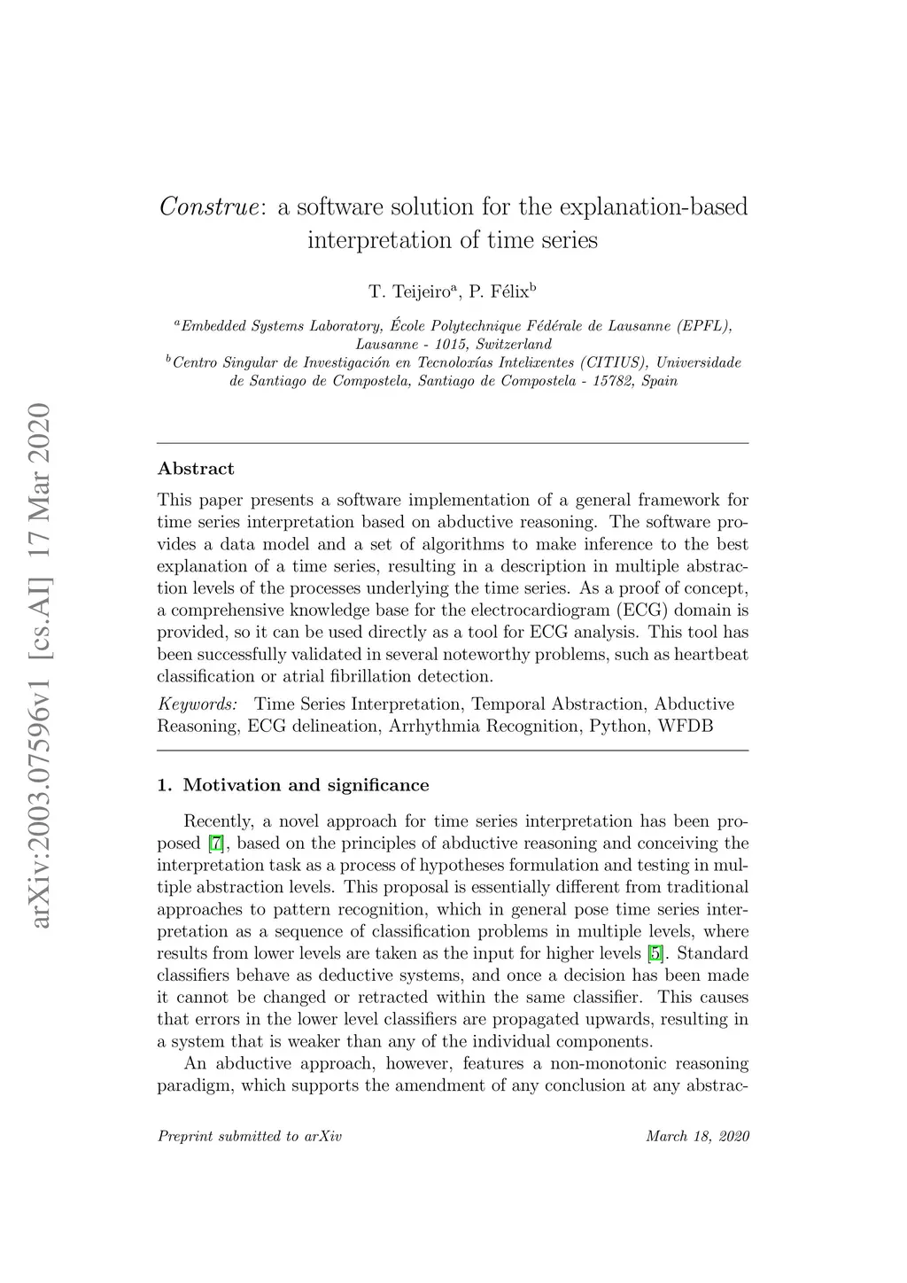 This paper presents a software implementation of a general framework for time series interpretation based on abductive reasoning. The software provides a data model and a set of algorithms to make inference to the best explanation of a time series, resulting in a description in multiple abstraction levels of the processes underlying the time series. As a proof of concept, a comprehensive knowledge base for the electrocardiogram (ECG) domain is provided, so it can be used directly as a tool for ECG analysis. This tool has been successfully validated in several noteworthy problems, such as heartbeat classification or atrial fibrillation detection.