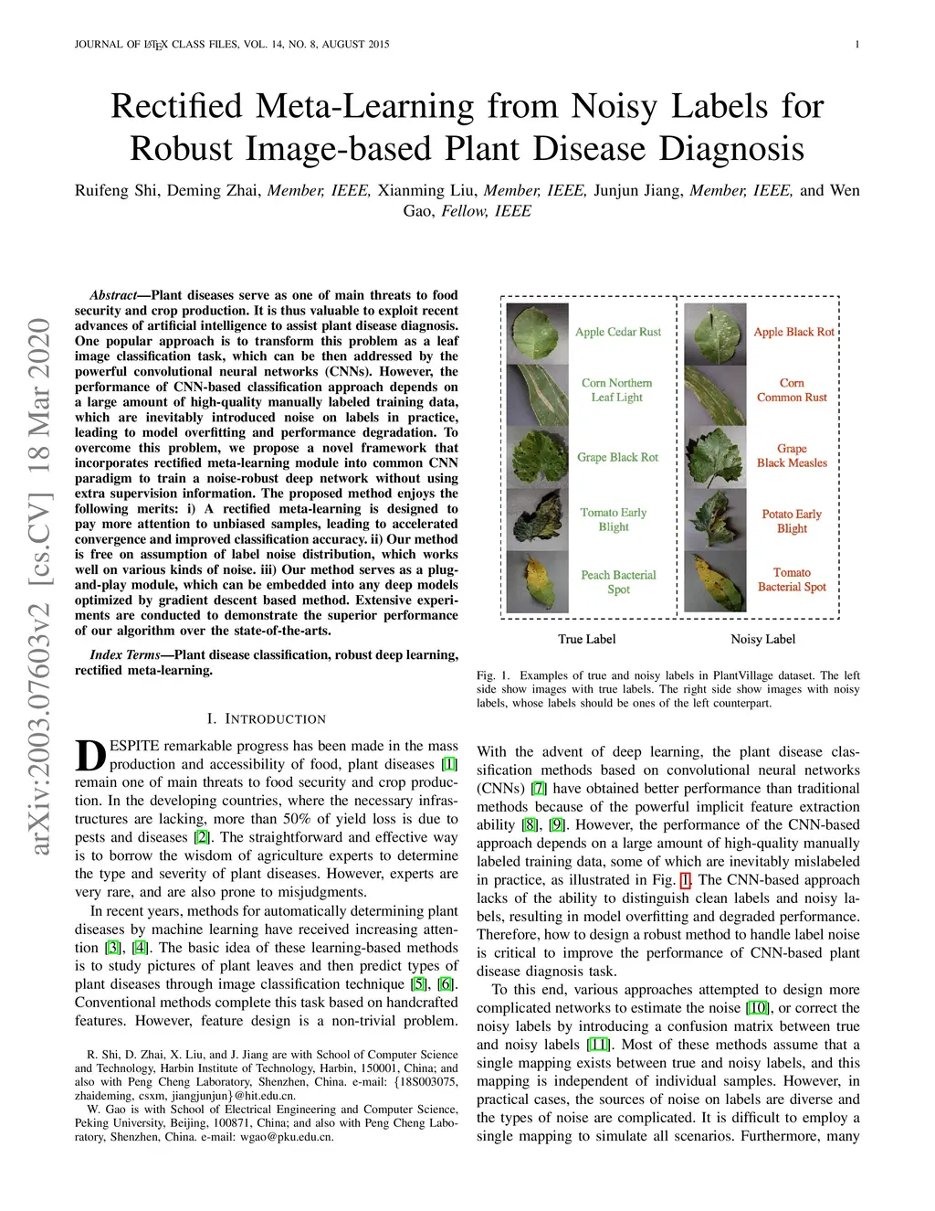 Plant diseases serve as one of main threats to food security and crop production. It is thus valuable to exploit recent advances of artificial intelligence to assist plant disease diagnosis. One popular approach is to transform this problem as a leaf image classification task, which can be then addressed by the powerful convolutional neural networks (CNNs). However, the performance of CNN-based classification approach depends on a large amount of high-quality manually labeled training data, which are inevitably introduced noise on labels in practice, leading to model overfitting and performance degradation. To overcome this problem, we propose a novel framework that incorporates rectified meta-learning module into common CNN paradigm to train a noise-robust deep network without using extra supervision information. The proposed method enjoys the following merits: i) A rectified meta-learning is designed to pay more attention to unbiased samples, leading to accelerated convergence and improved classification accuracy. ii) Our method is free on assumption of label noise distribution, which works well on various kinds of noise. iii) Our method serves as a plug-and-play module, which can be embedded into any deep models optimized by gradient descent based method. Extensive experiments are conducted to demonstrate the superior performance of our algorithm over the state-of-the-arts.