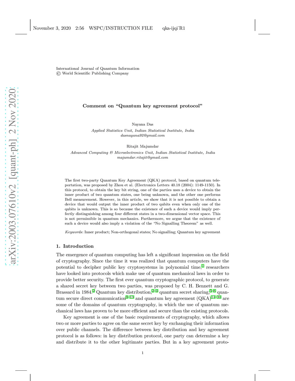 The first two party Quantum Key Agreement (QKA) protocol, based on quantum teleportation, was proposed by Zhou et al. (Electronics Letters 40.18 (2004): 1149-1150). In this protocol, to obtain the key bit string, one of the parties use a device to obtain inner product of two quantum states, one being unknown, and the other one performs Bell measurement. However, in this article, we show that it is not possible to obtain a device that would output the inner product of two qubits even when only one of the qubit is unknown. This is so because existence of such device would imply perfectly distinguishing among four different states in a two-dimensional vector space. This is not permissible in quantum mechanics. Furthermore, we argue that existence of such a device would also imply violation of the "No Signalling Theorem" as well. Finally, we also comment that this protocol is not a valid key agreement protocol at all.