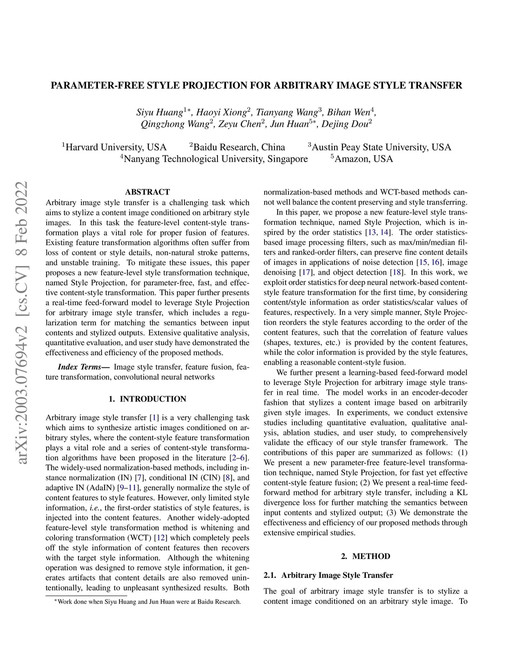 Parameter-Free Style Projection for Arbitrary Style Transfer