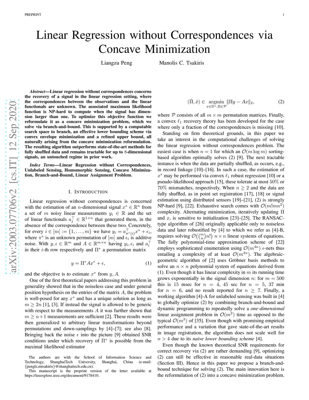 Linear Regression without Correspondences via Concave Minimization