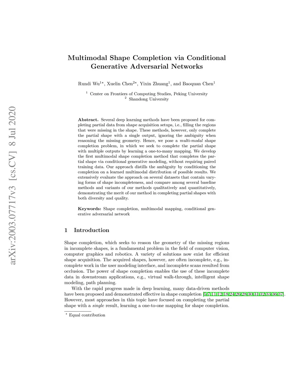 Several deep learning methods have been proposed for completing partial data from shape acquisition setups, i.e., filling the regions that were missing in the shape. These methods, however, only complete the partial shape with a single output, ignoring the ambiguity when reasoning the missing geometry. Hence, we pose a multi-modal shape completion problem, in which we seek to complete the partial shape with multiple outputs by learning a one-to-many mapping. We develop the first multimodal shape completion method that completes the partial shape via conditional generative modeling, without requiring paired training data. Our approach distills the ambiguity by conditioning the completion on a learned multimodal distribution of possible results. We extensively evaluate the approach on several datasets that contain varying forms of shape incompleteness, and compare among several baseline methods and variants of our methods qualitatively and quantitatively, demonstrating the merit of our method in completing partial shapes with both diversity and quality.