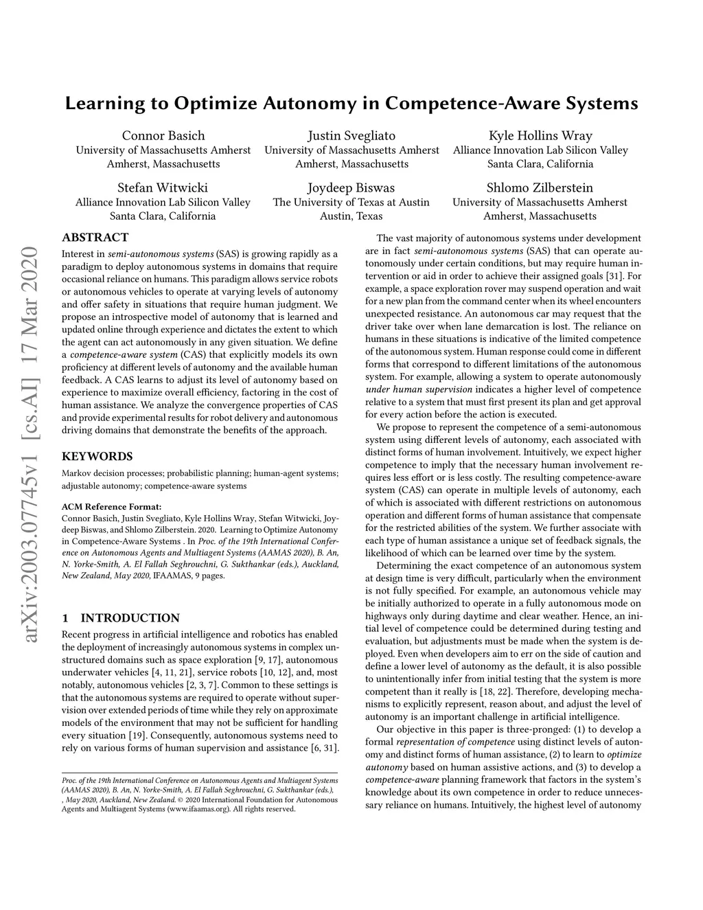 Interest in semi-autonomous systems (SAS) is growing rapidly as a paradigm to deploy autonomous systems in domains that require occasional reliance on humans. This paradigm allows service robots or autonomous vehicles to operate at varying levels of autonomy and offer safety in situations that require human judgment. We propose an introspective model of autonomy that is learned and updated online through experience and dictates the extent to which the agent can act autonomously in any given situation. We define a competence-aware system (CAS) that explicitly models its own proficiency at different levels of autonomy and the available human feedback. A CAS learns to adjust its level of autonomy based on experience to maximize overall efficiency, factoring in the cost of human assistance. We analyze the convergence properties of CAS and provide experimental results for robot delivery and autonomous driving domains that demonstrate the benefits of the approach.