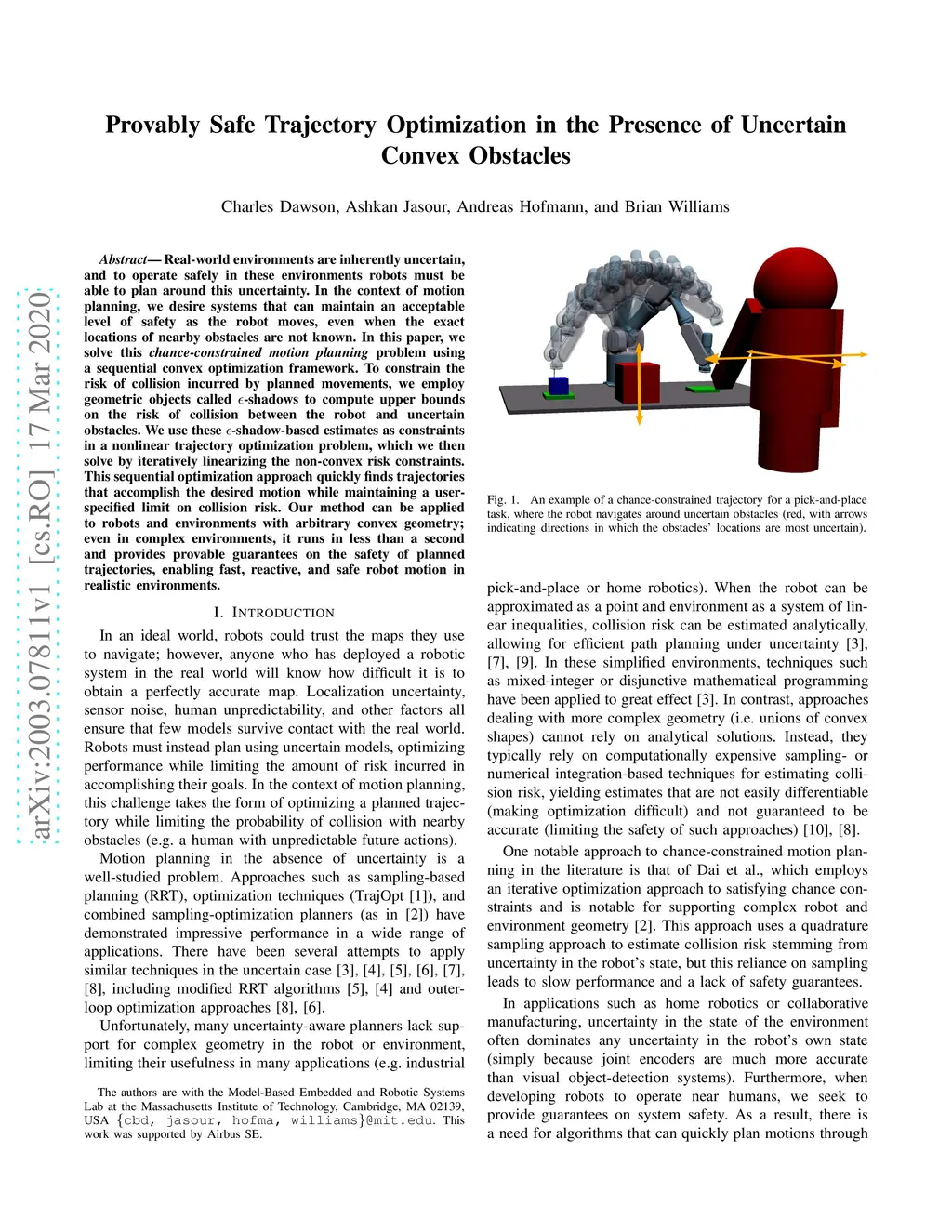 Real-world environments are inherently uncertain, and to operate safely in these environments robots must be able to plan around this uncertainty. In the context of motion planning, we desire systems that can maintain an acceptable level of safety as the robot moves, even when the exact locations of nearby obstacles are not known. In this paper, we solve this chance-constrained motion planning problem using a sequential convex optimization framework. To constrain the risk of collision incurred by planned movements, we employ geometric objects called -shadows to compute upper bounds on the risk of collision between the robot and uncertain obstacles. We use these -shadow-based estimates as constraints in a nonlinear trajectory optimization problem, which we then solve by iteratively linearizing the non-convex risk constraints. This sequential optimization approach quickly finds trajectories that accomplish the desired motion while maintaining a user-specified limit on collision risk. Our method can be applied to robots and environments with arbitrary convex geometry; even in complex environments, it runs in less than a second and provides provable guarantees on the safety of planned trajectories, enabling fast, reactive, and safe robot motion in realistic environments.