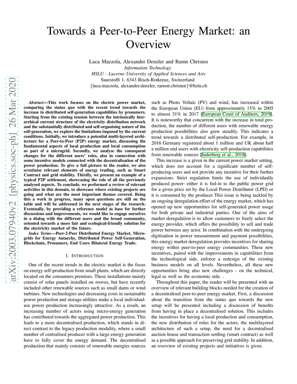 This work focuses on the electric power market, comparing the status quo with the recent trend towards the increase in distributed self-generation capabilities by prosumers. Starting from the existing tension between the intrinsically hierarchical current structure of the electricity distribution network and the substantially distributed and self-organising nature of the self-generation, we explore the limitations imposed by the current conditions. Initially, we introduce a potential multi-layered architecture for a Peer-to-Peer (P2P) energy market, discussing the fundamental aspects of local production and local consumption as part of a microgrid. Secondly, we analyse the consequent changes for the different users' roles, also in connection with some incentive models connected with the decentralisation of the power production. To give a full picture to the reader, we also scrutinise relevant elements of energy trading, such as Smart Contract and grid stability. Thirdly, we present an example of a typical P2P settlement, showcasing the role of all the previously analysed aspects. To conclude, we performed a review of relevant activities in this domain, to showcase where existing projects are going and what are the most important themes covered. Being this a work in progress, many open questions are still on the table and will be addressed in the next stages of the research. Eventually, by providing a reference model as base for further discussions and improvements, we would like to engage ourselves in a dialog with the different users and the broad community, oriented towards a more fair and ecological-friendly solution for the electricity market of the future.