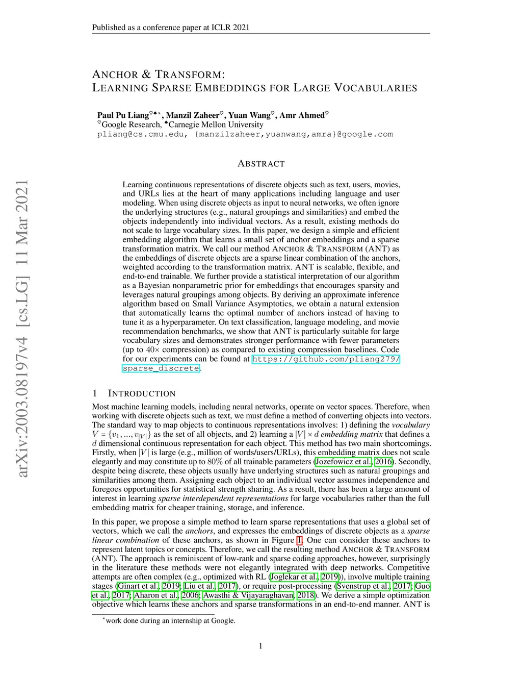 Learning continuous representations of discrete objects such as text, users, movies, and URLs lies at the heart of many applications including language and user modeling. When using discrete objects as input to neural networks, we often ignore the underlying structures (e.g., natural groupings and similarities) and embed the objects independently into individual vectors. As a result, existing methods do not scale to large vocabulary sizes. In this paper, we design a simple and efficient embedding algorithm that learns a small set of anchor embeddings and a sparse transformation matrix. We call our method Anchor & Transform (ANT) as the embeddings of discrete objects are a sparse linear combination of the anchors, weighted according to the transformation matrix. ANT is scalable, flexible, and end-to-end trainable. We further provide a statistical interpretation of our algorithm as a Bayesian nonparametric prior for embeddings that encourages sparsity and leverages natural groupings among objects. By deriving an approximate inference algorithm based on Small Variance Asymptotics, we obtain a natural extension that automatically learns the optimal number of anchors instead of having to tune it as a hyperparameter. On text classification, language modeling, and movie recommendation benchmarks, we show that ANT is particularly suitable for large vocabulary sizes and demonstrates stronger performance with fewer parameters (up to 40x compression) as compared to existing compression baselines.