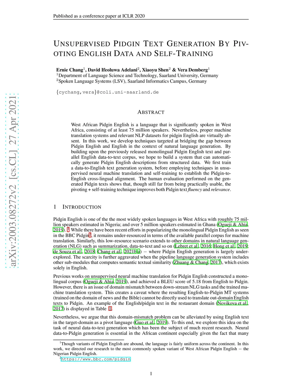 West African Pidgin English is a language that is significantly spoken in West Africa, consisting of at least 75 million speakers. Nevertheless, proper machine translation systems and relevant NLP datasets for pidgin English are virtually absent. In this work, we develop techniques targeted at bridging the gap between Pidgin English and English in the context of natural language generation. %As a proof of concept, we explore the proposed techniques in the area of data-to-text generation. By building upon the previously released monolingual Pidgin English text and parallel English data-to-text corpus, we hope to build a system that can automatically generate Pidgin English descriptions from structured data. We first train a data-to-English text generation system, before employing techniques in unsupervised neural machine translation and self-training to establish the Pidgin-to-English cross-lingual alignment. The human evaluation performed on the generated Pidgin texts shows that, though still far from being practically usable, the pivoting + self-training technique improves both Pidgin text fluency and relevance.