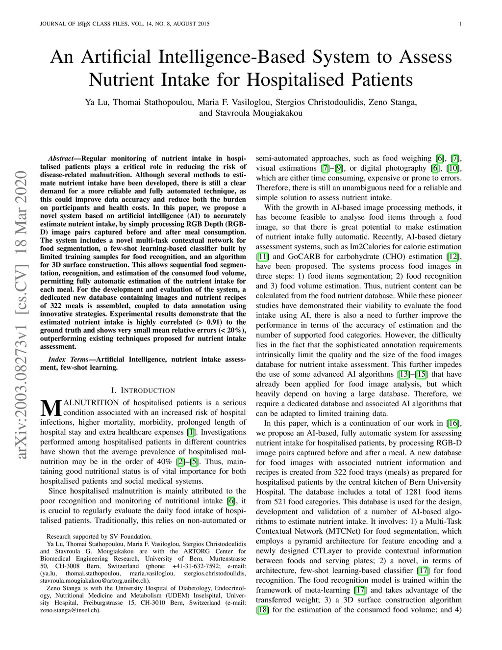 Regular monitoring of nutrient intake in hospitalised patients plays a critical role in reducing the risk of disease-related malnutrition. Although several methods to estimate nutrient intake have been developed, there is still a clear demand for a more reliable and fully automated technique, as this could improve data accuracy and reduce both the burden on participants and health costs. In this paper, we propose a novel system based on artificial intelligence (AI) to accurately estimate nutrient intake, by simply processing RGB Depth (RGB-D) image pairs captured before and after meal consumption. The system includes a novel multi-task contextual network for food segmentation, a few-shot learning-based classifier built by limited training samples for food recognition, and an algorithm for 3D surface construction. This allows sequential food segmentation, recognition, and estimation of the consumed food volume, permitting fully automatic estimation of the nutrient intake for each meal. For the development and evaluation of the system, a dedicated new database containing images and nutrient recipes of 322 meals is assembled, coupled to data annotation using innovative strategies. Experimental results demonstrate that the estimated nutrient intake is highly correlated (> 0.91) to the ground truth and shows very small mean relative errors (< 20%), outperforming existing techniques proposed for nutrient intake assessment.