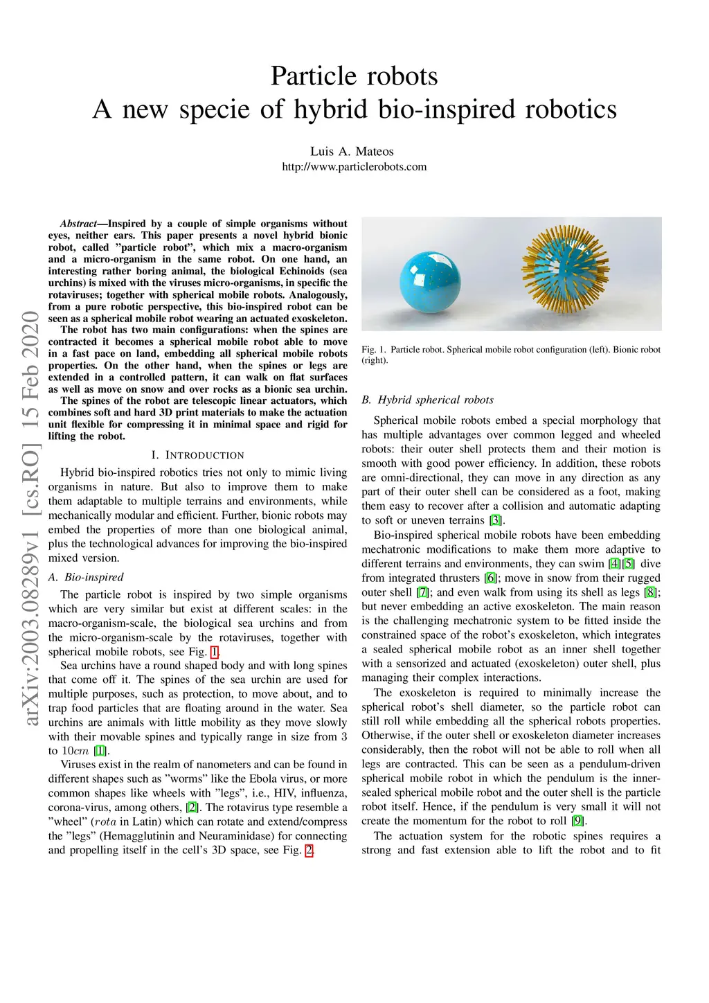 Inspired by a couple of simple organisms without eyes, neither ears. This paper presents a novel hybrid bionic robot, called "particle robot", which mix a macro-organism and a micro-organism in the same robot. On one hand, an interesting rather boring animal, the biological Echinoids (sea urchins) is mixed with the viruses micro-organisms, in specific the rotaviruses; together with spherical mobile robots. Analogously, from a pure robotic perspective, this bio-inspired robot can be seen as a spherical mobile robot wearing an actuated exoskeleton. The robot has two main configurations: when the spines are contracted it becomes a spherical mobile robot able to move in a fast pace on land, embedding all spherical mobile robots properties. On the other hand, when the spines or legs are extended in a controlled pattern, it can walk on flat surfaces as well as move on snow and over rocks as a bionic sea urchin. The spines of the robot are telescopic linear actuators, which combines soft and hard 3D print materials to make the actuation unit flexible for compressing it in minimal space and rigid for lifting the robot.