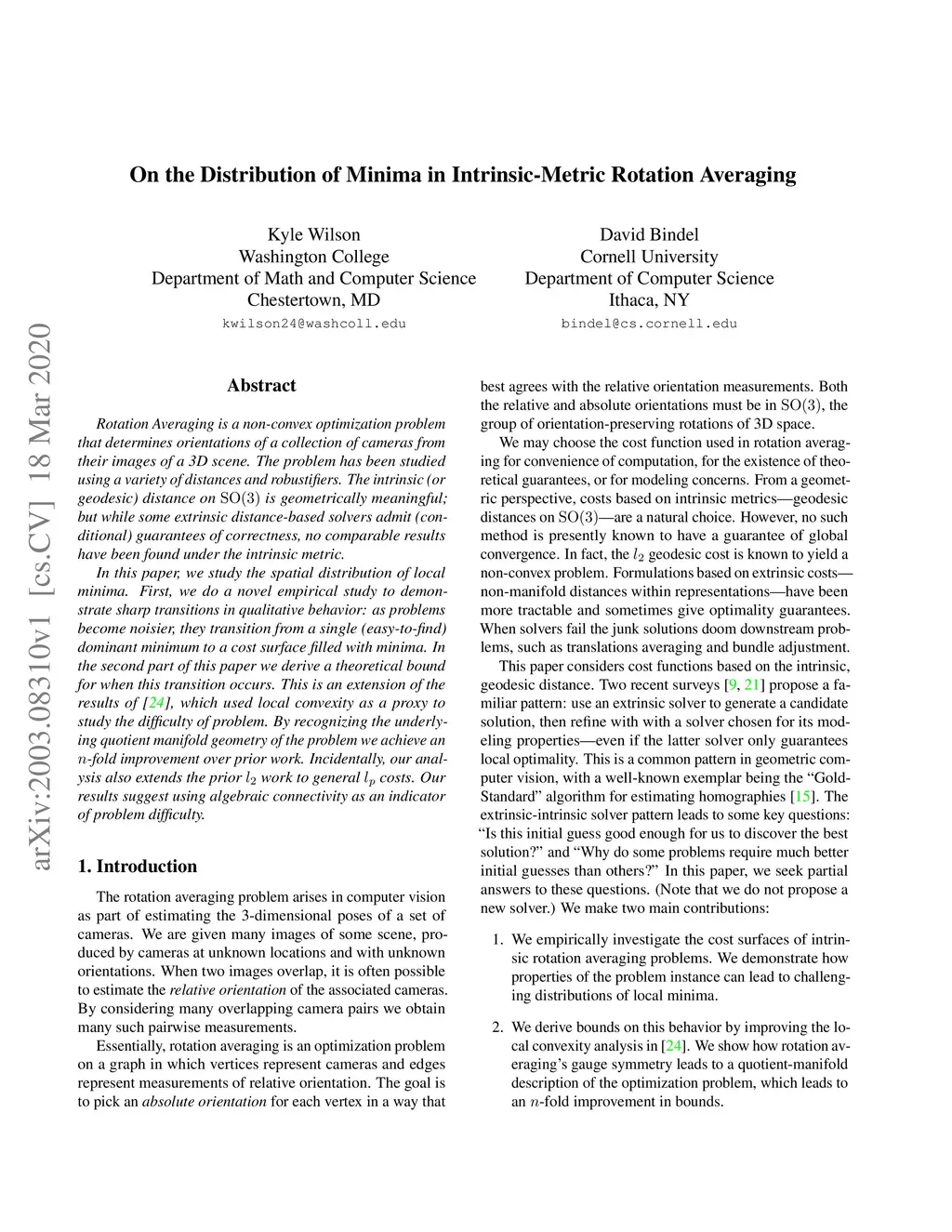 Rotation Averaging is a non-convex optimization problem that determines orientations of a collection of cameras from their images of a 3D scene. The problem has been studied using a variety of distances and robustifiers. The intrinsic (or geodesic) distance on SO(3) is geometrically meaningful; but while some extrinsic distance-based solvers admit (conditional) guarantees of correctness, no comparable results have been found under the intrinsic metric. In this paper, we study the spatial distribution of local minima. First, we do a novel empirical study to demonstrate sharp transitions in qualitative behavior: as problems become noisier, they transition from a single (easy-to-find) dominant minimum to a cost surface filled with minima. In the second part of this paper we derive a theoretical bound for when this transition occurs. This is an extension of the results of [24], which used local convexity as a proxy to study the difficulty of problem. By recognizing the underlying quotient manifold geometry of the problem we achieve an n-fold improvement over prior work. Incidentally, our analysis also extends the prior work to general costs. Our results suggest using algebraic connectivity as an indicator of problem difficulty.