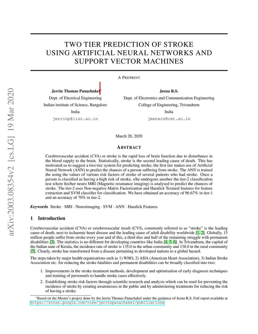 Cerebrovascular accident (CVA) or stroke is the rapid loss of brain function due to disturbance in the blood supply to the brain. Statistically, stroke is the second leading cause of death. This has motivated us to suggest a two-tier system for predicting stroke; the first tier makes use of Artificial Neural Network (ANN) to predict the chances of a person suffering from stroke. The ANN is trained the using the values of various risk factors of stroke of several patients who had stroke. Once a person is classified as having a high risk of stroke, s/he undergoes another the tier-2 classification test where his/her neuro MRI (Magnetic resonance imaging) is analysed to predict the chances of stroke. The tier-2 uses Non-negative Matrix Factorization and Haralick Textural features for feature extraction and SVM classifier for classification. We have obtained an accuracy of 96.67% in tier-1 and an accuracy of 70% in tier-2.