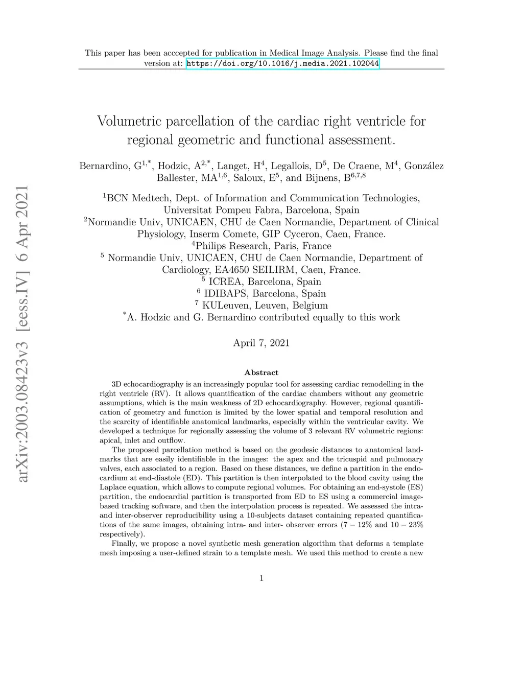 3D echocardiography is an increasingly popular tool for assessing cardiac remodelling in the right ventricle (RV). It allows quantification of the cardiac chambers without any geometric assumptions, which is the main weakness of 2D echocardiography. However, regional quantification of geometry and function is limited by the lower spatial and temporal resolution and the scarcity of identifiable anatomical landmarks. We developed a technique for regionally assessing the 3 relevant RV regions: apical, inlet and outflow. The method's inputs are end-diastolic (ED) and end-systolic (ES) segmented 3D surface models. The method first defines a partition of the ED endocardium using the geodesic distances from each surface point to apex, tricuspid valve and pulmonary valve: the landmarks that define the 3 regions. The ED surface mesh is then tetrahedralised, and the endocardial-defined partition is interpolated in the blood cavity via the Laplace equation. For obtaining an ES partition, the endocardial partition is transported from ED to ES using a commercial image-based tracking, and then interpolated towards the endocardium, similarly to ED, for computing volumes and ejection fraction (EF). We present a full assessment of the method's validity and reproducibility. First, we assess reproducibility under segmentation variability, obtaining intra- and inter- observer errors (4-10% and 10-23% resp.). Finally, we use a synthetic remodelling dataset to identify the situations in which our method is able to correctly determine the region that has remodelled. This dataset is generated by a novel mesh reconstruction method that deforms a reference mesh, locally imposing a given strain, expressed in anatomical coordinates. We show that the parcellation method is adequate for capturing local circumferential and global circumferential and longitudinal RV remodelling.