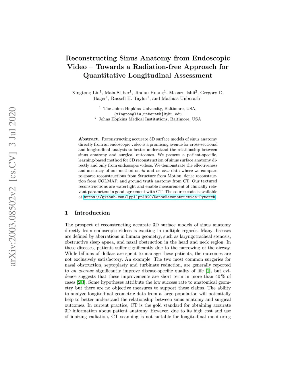Reconstructing accurate 3D surface models of sinus anatomy directly from an endoscopic video is a promising avenue for cross-sectional and longitudinal analysis to better understand the relationship between sinus anatomy and surgical outcomes. We present a patient-specific, learning-based method for 3D reconstruction of sinus surface anatomy directly and only from endoscopic videos. We demonstrate the effectiveness and accuracy of our method on in and ex vivo data where we compare to sparse reconstructions from Structure from Motion, dense reconstruction from COLMAP, and ground truth anatomy from CT. Our textured reconstructions are watertight and enable measurement of clinically relevant parameters in good agreement with CT. The source code is available at https://github.com/lppllppl920/DenseReconstruction-Pytorch.