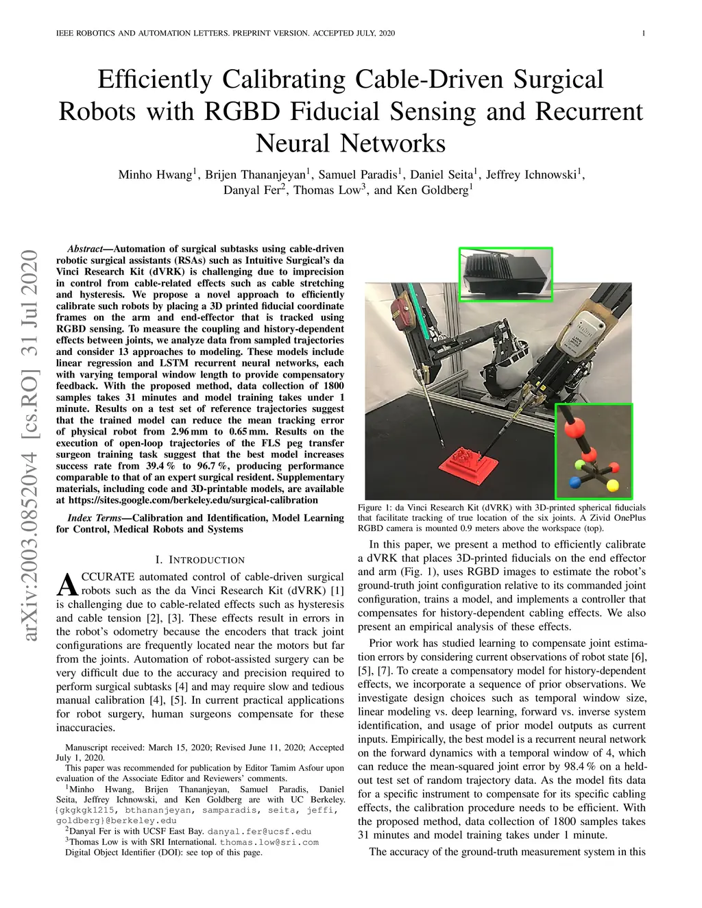 Automation of surgical subtasks using cable-driven robotic surgical assistants (RSAs) such as Intuitive Surgical's da Vinci Research Kit (dVRK) is challenging due to imprecision in control from cable-related effects such as cable stretching and hysteresis. We propose a novel approach to efficiently calibrate such robots by placing a 3D printed fiducial coordinate frames on the arm and end-effector that is tracked using RGBD sensing. To measure the coupling and history-dependent effects between joints, we analyze data from sampled trajectories and consider 13 approaches to modeling. These models include linear regression and LSTM recurrent neural networks, each with varying temporal window length to provide compensatory feedback. With the proposed method, data collection of 1800 samples takes 31 minutes and model training takes under 1 minute. Results on a test set of reference trajectories suggest that the trained model can reduce the mean tracking error of the physical robot from 2.96 mm to 0.65 mm. Results on the execution of open-loop trajectories of the FLS peg transfer surgeon training task suggest that the best model increases success rate from 39.4 % to 96.7 %, producing performance comparable to that of an expert surgical resident. Supplementary materials, including code and 3D-printable models, are available at https://sites.google.com/berkeley.edu/surgical-calibration