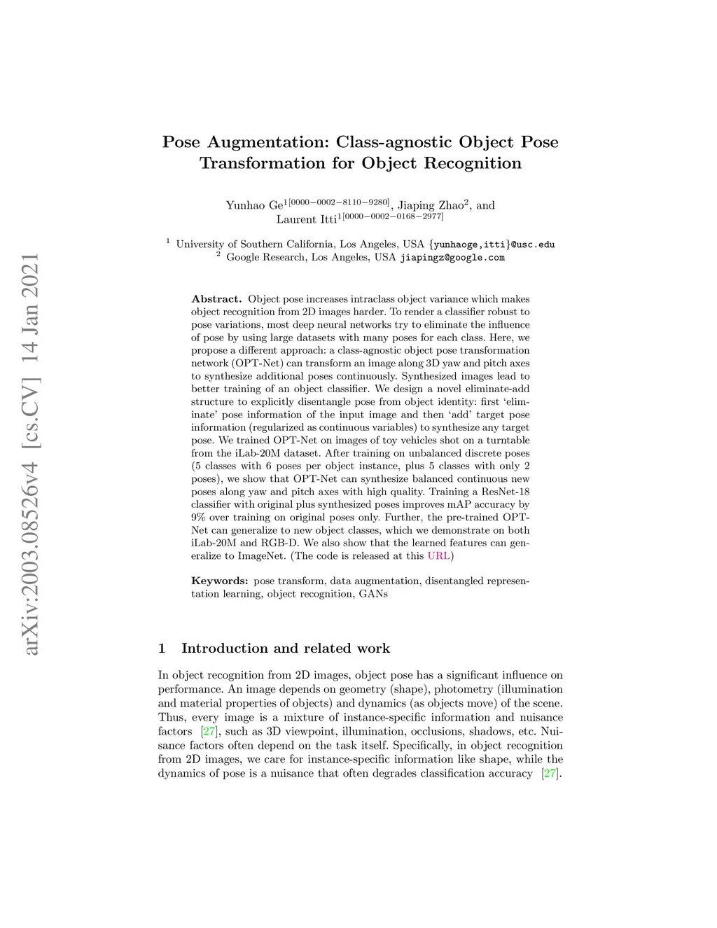 Object pose increases intraclass object variance which makes object recognition from 2D images harder. To render a classifier robust to pose variations, most deep neural networks try to eliminate the influence of pose by using large datasets with many poses for each class. Here, we propose a different approach: a class-agnostic object pose transformation network (OPT-Net) can transform an image along 3D yaw and pitch axes to synthesize additional poses continuously. Synthesized images lead to better training of an object classifier. We design a novel eliminate-add structure to explicitly disentangle pose from object identity: first eliminate pose information of the input image and then add target pose information (regularized as continuous variables) to synthesize any target pose. We trained OPT-Net on images of toy vehicles shot on a turntable from the iLab-20M dataset. After training on unbalanced discrete poses (5 classes with 6 poses per object instance, plus 5 classes with only 2 poses), we show that OPT-Net can synthesize balanced continuous new poses along yaw and pitch axes with high quality. Training a ResNet-18 classifier with original plus synthesized poses improves mAP accuracy by 9% overtraining on original poses only. Further, the pre-trained OPT-Net can generalize to new object classes, which we demonstrate on both iLab-20M and RGB-D. We also show that the learned features can generalize to ImageNet.