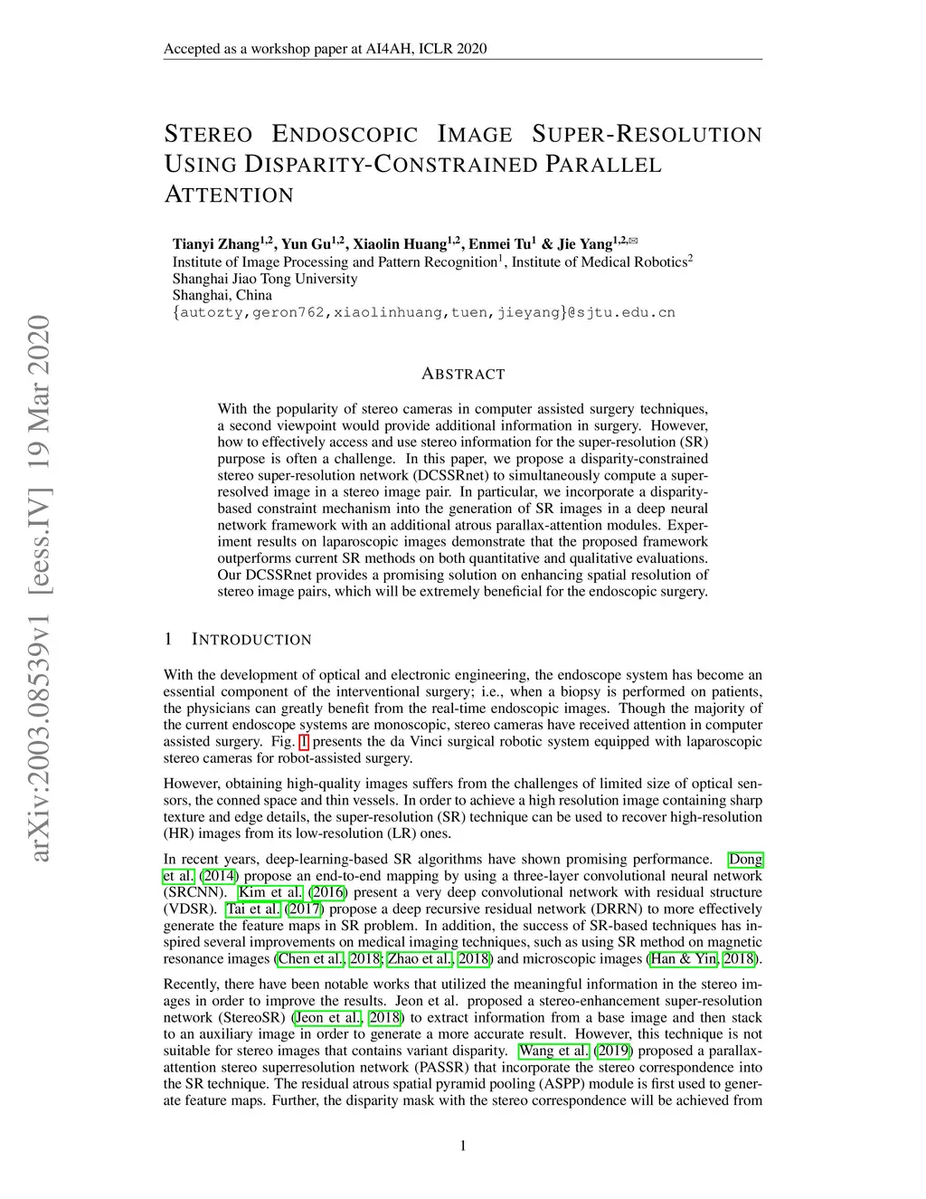 With the popularity of stereo cameras in computer assisted surgery techniques, a second viewpoint would provide additional information in surgery. However, how to effectively access and use stereo information for the super-resolution (SR) purpose is often a challenge. In this paper, we propose a disparity-constrained stereo super-resolution network (DCSSRnet) to simultaneously compute a super-resolved image in a stereo image pair. In particular, we incorporate a disparity-based constraint mechanism into the generation of SR images in a deep neural network framework with an additional atrous parallax-attention modules. Experiment results on laparoscopic images demonstrate that the proposed framework outperforms current SR methods on both quantitative and qualitative evaluations. Our DCSSRnet provides a promising solution on enhancing spatial resolution of stereo image pairs, which will be extremely beneficial for the endoscopic surgery.