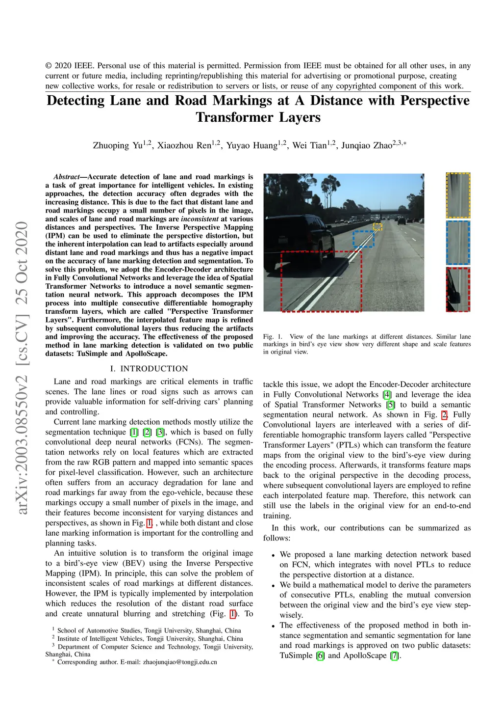 Accurate detection of lane and road markings is a task of great importance for intelligent vehicles. In existing approaches, the detection accuracy often degrades with the increasing distance. This is due to the fact that distant lane and road markings occupy a small number of pixels in the image, and scales of lane and road markings are inconsistent at various distances and perspectives. The Inverse Perspective Mapping (IPM) can be used to eliminate the perspective distortion, but the inherent interpolation can lead to artifacts especially around distant lane and road markings and thus has a negative impact on the accuracy of lane marking detection and segmentation. To solve this problem, we adopt the Encoder-Decoder architecture in Fully Convolutional Networks and leverage the idea of Spatial Transformer Networks to introduce a novel semantic segmentation neural network. This approach decomposes the IPM process into multiple consecutive differentiable homographic transform layers, which are called "Perspective Transformer Layers". Furthermore, the interpolated feature map is refined by subsequent convolutional layers thus reducing the artifacts and improving the accuracy. The effectiveness of the proposed method in lane marking detection is validated on two public datasets: TuSimple and ApolloScape