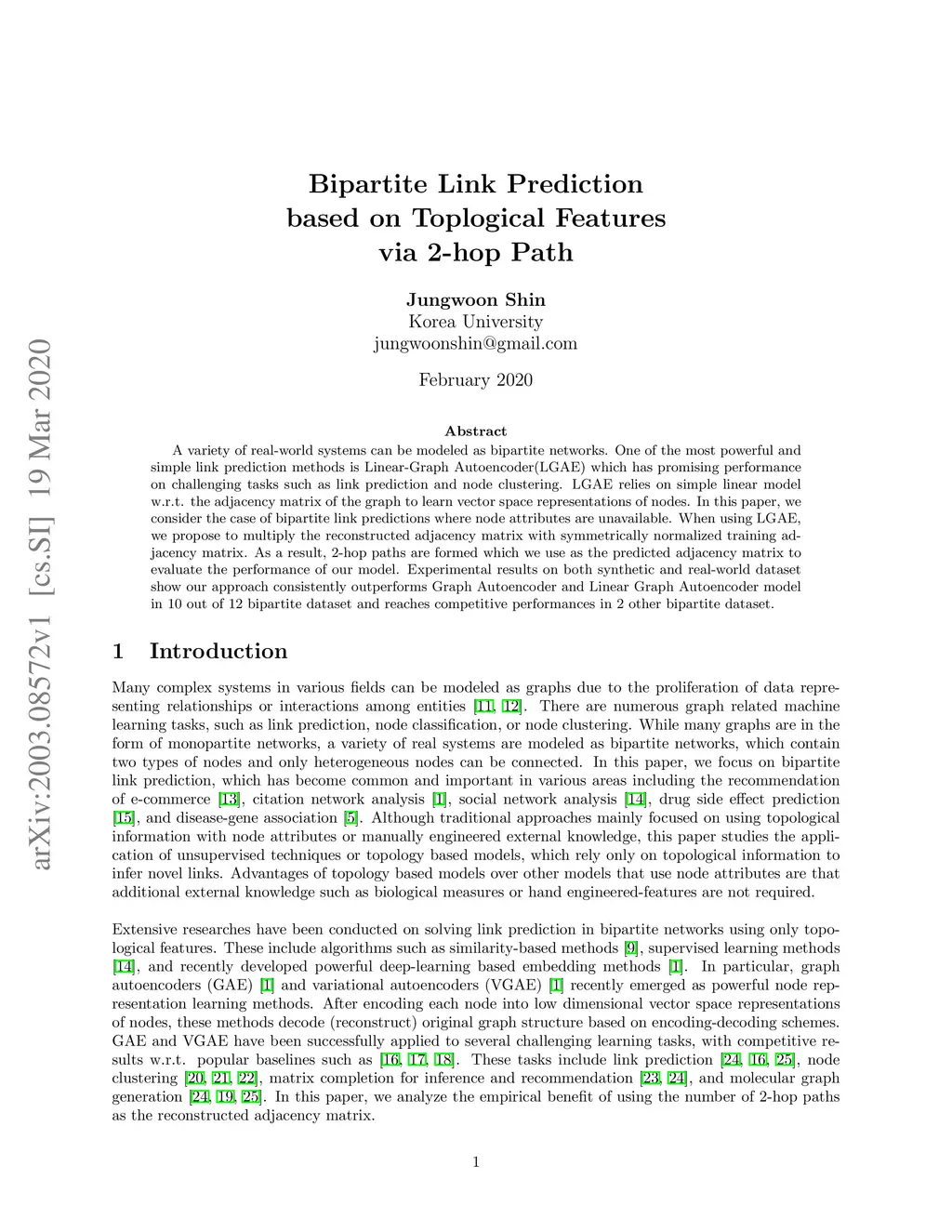 A variety of real-world systems can be modeled as bipartite networks. One of the most powerful and simple link prediction methods is Linear-Graph Autoencoder(LGAE) which has promising performance on challenging tasks such as link prediction and node clustering. LGAE relies on simple linear model w.r.t. the adjacency matrix of the graph to learn vector space representations of nodes. In this paper, we consider the case of bipartite link predictions where node attributes are unavailable. When using LGAE, we propose to multiply the reconstructed adjacency matrix with a symmetrically normalized training adjacency matrix. As a result, 2-hop paths are formed which we use as the predicted adjacency matrix to evaluate the performance of our model. Experimental results on both synthetic and real-world dataset show our approach consistently outperforms Graph Autoencoder and Linear Graph Autoencoder model in 10 out of 12 bipartite dataset and reaches competitive performances in 2 other bipartite dataset.