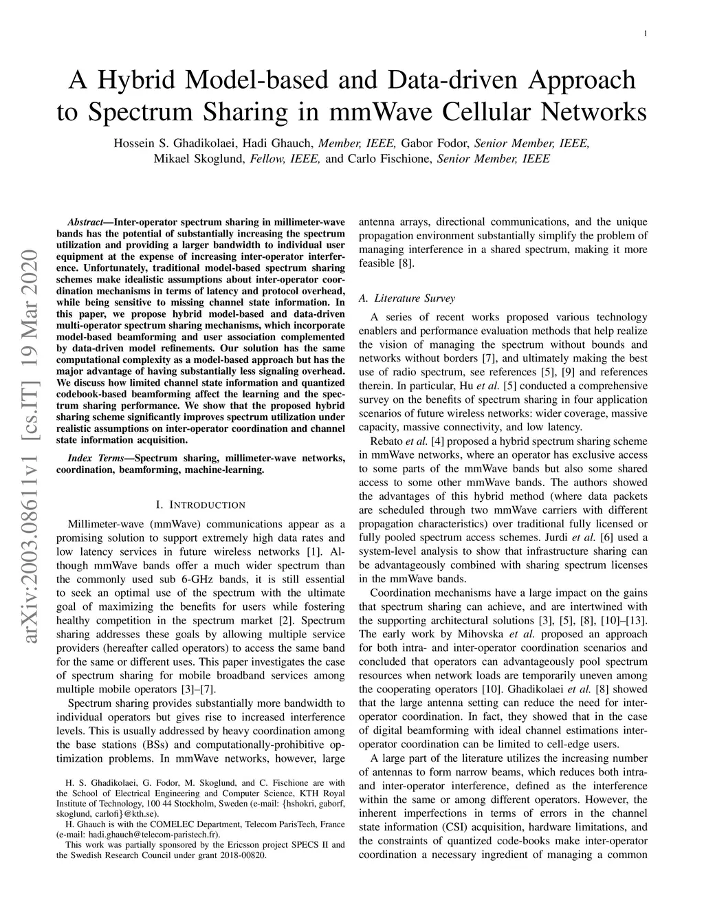 Inter-operator spectrum sharing in millimeter-wave bands has the potential of substantially increasing the spectrum utilization and providing a larger bandwidth to individual user equipment at the expense of increasing inter-operator interference. Unfortunately, traditional model-based spectrum sharing schemes make idealistic assumptions about inter-operator coordination mechanisms in terms of latency and protocol overhead, while being sensitive to missing channel state information. In this paper, we propose hybrid model-based and data-driven multi-operator spectrum sharing mechanisms, which incorporate model-based beamforming and user association complemented by data-driven model refinements. Our solution has the same computational complexity as a model-based approach but has the major advantage of having substantially less signaling overhead. We discuss how limited channel state information and quantized codebook-based beamforming affect the learning and the spectrum sharing performance. We show that the proposed hybrid sharing scheme significantly improves spectrum utilization under realistic assumptions on inter-operator coordination and channel state information acquisition.