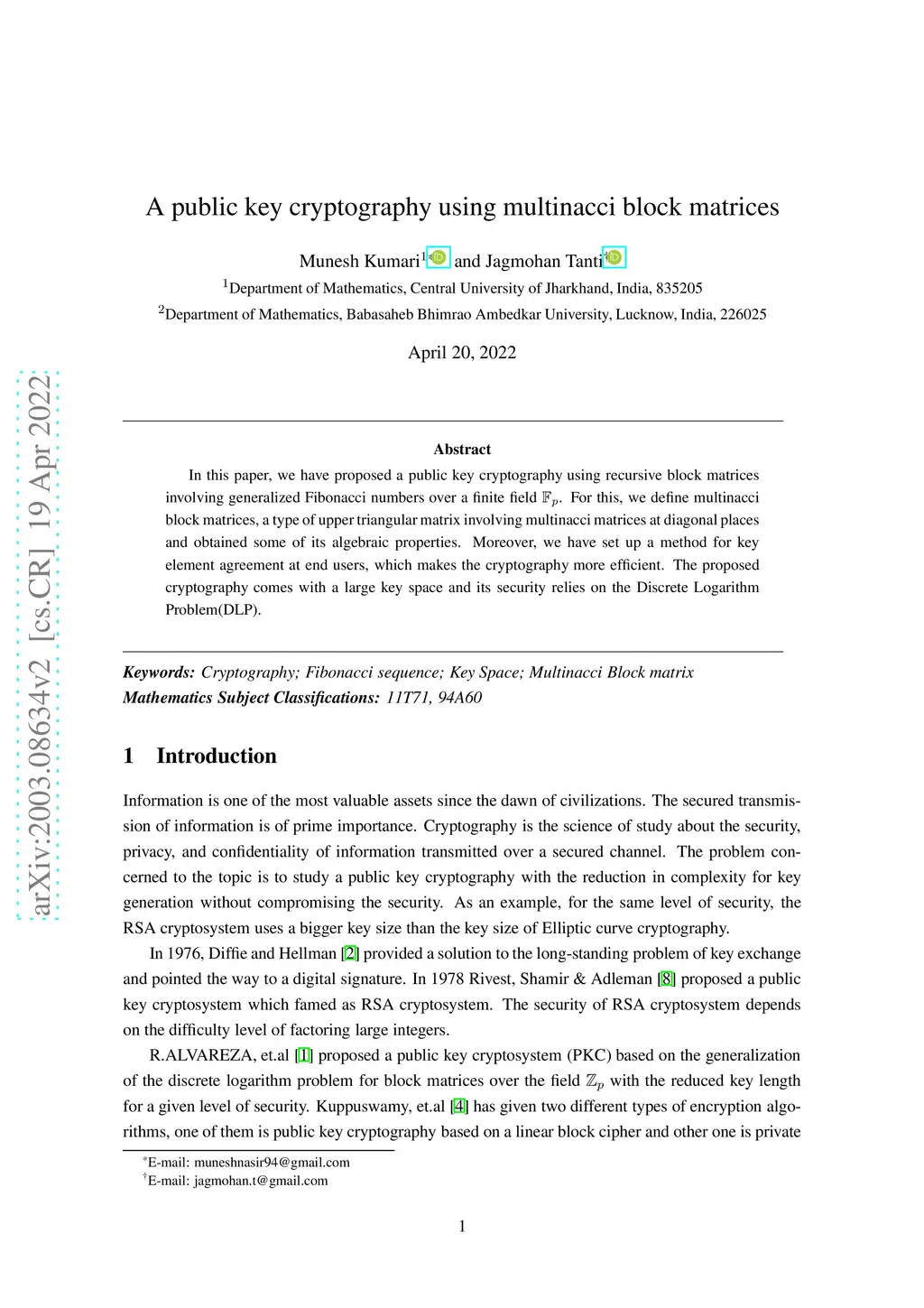 In this paper, we have proposed a public key cryptography using recursive block matrices involving generalized Fibonacci numbers over a finite field Fp. For this, we define multinacci block matrices, a type of upper triangular matrix involving multinacci matrices at diagonal places and obtained some of its algebraic properties. Moreover, we have set up a method for key element agreement at end users, which makes the cryptography more efficient. The proposed cryptography comes with a large keyspace and its security relies on the Discrete Logarithm Problem(DLP).