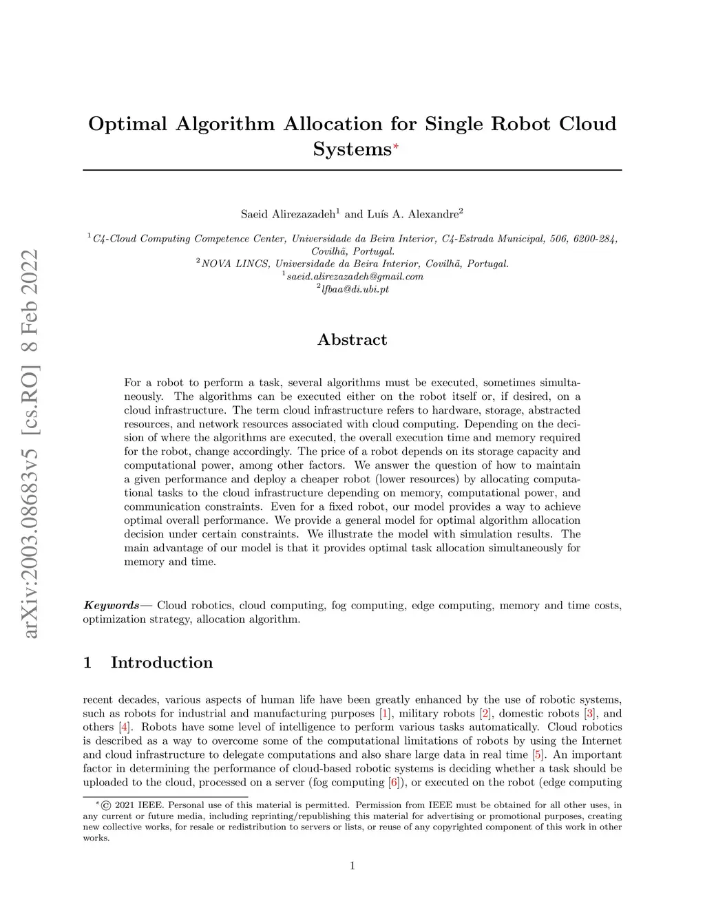 In order for a robot to perform a task, several algorithms need to be executed, sometimes, simultaneously. Algorithms can be run either on the robot itself or, upon request, be performed on cloud infrastructure. The term cloud infrastructure is used to describe hardware, storage, abstracted resources, and network resources related to cloud computing. Depending on the decisions on where to execute the algorithms, the overall execution time and necessary memory space for the robot will change accordingly. The price of a robot depends, among other things, on its memory capacity and computational power. We answer the question of how to keep a given performance and use a cheaper robot (lower resources) by assigning computational tasks to the cloud infrastructure, depending on memory, computational power, and communication constraints. Also, for a fixed robot, our model provides a way to have optimal overall performance. We provide a general model for the optimal decision of algorithm allocation under certain constraints. We exemplify the model with simulation results. The main advantage of our model is that it provides an optimal task allocation simultaneously for memory and time.