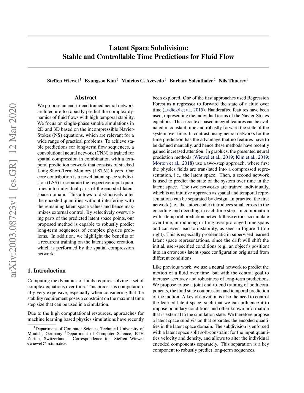 We propose an end-to-end trained neural networkarchitecture to robustly predict the complex dynamics of fluid flows with high temporal stability. We focus on single-phase smoke simulations in 2D and 3D based on the incompressible Navier-Stokes (NS) equations, which are relevant for a wide range of practical problems. To achieve stable predictions for long-term flow sequences, a convolutional neural network (CNN) is trained for spatial compression in combination with a temporal prediction network that consists of stacked Long Short-Term Memory (LSTM) layers. Our core contribution is a novel latent space subdivision (LSS) to separate the respective input quantities into individual parts of the encoded latent space domain. This allows to distinctively alter the encoded quantities without interfering with the remaining latent space values and hence maximizes external control. By selectively overwriting parts of the predicted latent space points, our proposed method is capable to robustly predict long-term sequences of complex physics problems. In addition, we highlight the benefits of a recurrent training on the latent space creation, which is performed by the spatial compression network.