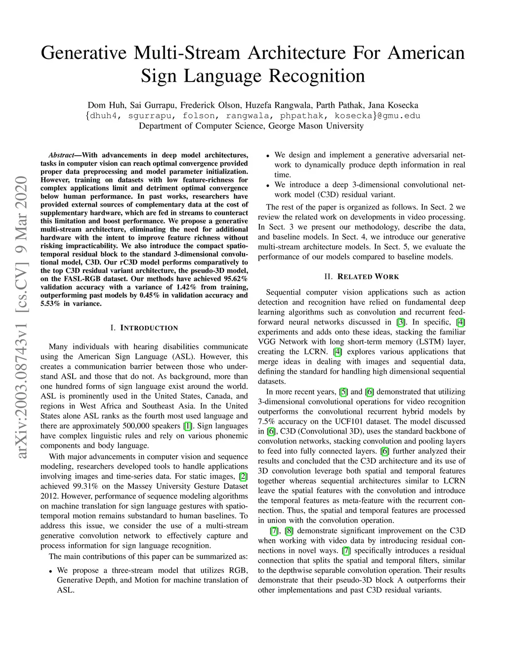 With advancements in deep model architectures, tasks in computer vision can reach optimal convergence provided proper data preprocessing and model parameter initialization. However, training on datasets with low feature-richness for complex applications limit and detriment optimal convergence below human performance. In past works, researchers have provided external sources of complementary data at the cost of supplementary hardware, which are fed in streams to counteract this limitation and boost performance. We propose a generative multi-stream architecture, eliminating the need for additional hardware with the intent to improve feature richness without risking impracticability. We also introduce the compact spatio-temporal residual block to the standard 3-dimensional convolutional model, C3D. Our rC3D model performs comparatively to the top C3D residual variant architecture, the pseudo-3D model, on the FASL-RGB dataset. Our methods have achieved 95.62% validation accuracy with a variance of 1.42% from training, outperforming past models by 0.45% in validation accuracy and 5.53% in variance.