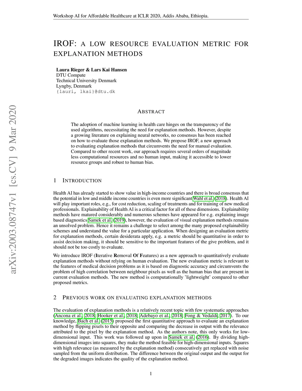 The adoption of machine learning in health care hinges on the transparency of the used algorithms, necessitating the need for explanation methods. However, despite a growing literature on explaining neural networks, no consensus has been reached on how to evaluate those explanation methods. We propose IROF, a new approach to evaluating explanation methods that circumvents the need for manual evaluation. Compared to other recent work, our approach requires several orders of magnitude less computational resources and no human input, making it accessible to lower resource groups and robust to human bias.