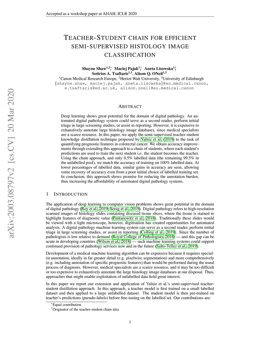 Teacher-Student chain for efficient semi-supervised histology image