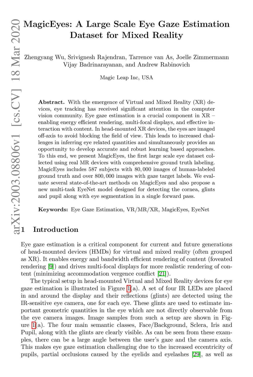 With the emergence of Virtual and Mixed Reality (XR) devices, eye tracking has received significant attention in the computer vision community. Eye gaze estimation is a crucial component in XR -- enabling energy efficient rendering, multi-focal displays, and effective interaction with content. In head-mounted XR devices, the eyes are imaged off-axis to avoid blocking the field of view. This leads to increased challenges in inferring eye related quantities and simultaneously provides an opportunity to develop accurate and robust learning based approaches. To this end, we present MagicEyes, the first large scale eye dataset collected using real MR devices with comprehensive ground truth labeling. MagicEyes includes subjects with images of human-labeled ground truth and over images with gaze target labels. We evaluate several state-of-the-art methods on MagicEyes and also propose a new multi-task EyeNet model designed for detecting the cornea, glints and pupil along with eye segmentation in a single forward pass.