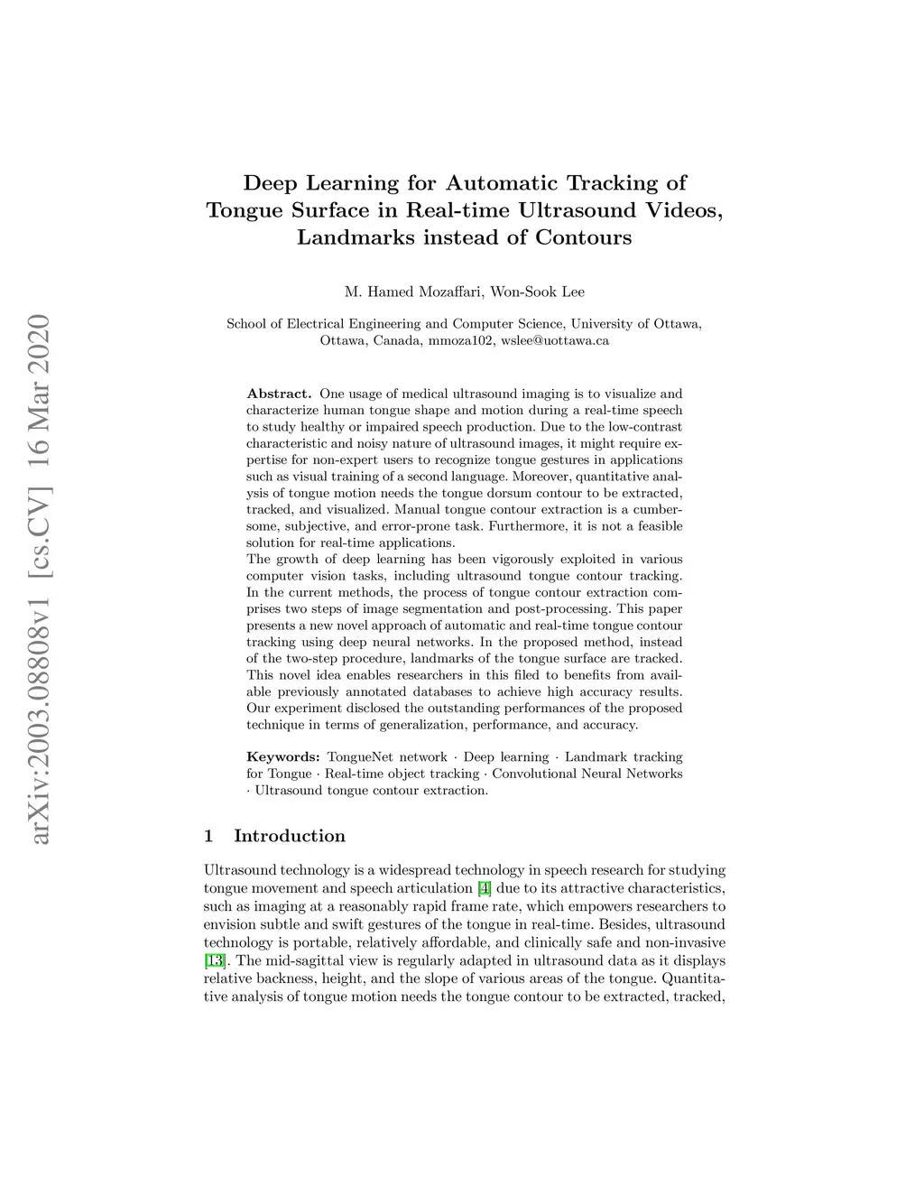 One usage of medical ultrasound imaging is to visualize and characterize human tongue shape and motion during a real-time speech to study healthy or impaired speech production. Due to the low-contrast characteristic and noisy nature of ultrasound images, it might require expertise for non-expert users to recognize tongue gestures in applications such as visual training of a second language. Moreover, quantitative analysis of tongue motion needs the tongue dorsum contour to be extracted, tracked, and visualized. Manual tongue contour extraction is a cumbersome, subjective, and error-prone task. Furthermore, it is not a feasible solution for real-time applications. The growth of deep learning has been vigorously exploited in various computer vision tasks, including ultrasound tongue contour tracking. In the current methods, the process of tongue contour extraction comprises two steps of image segmentation and post-processing. This paper presents a new novel approach of automatic and real-time tongue contour tracking using deep neural networks. In the proposed method, instead of the two-step procedure, landmarks of the tongue surface are tracked. This novel idea enables researchers in this filed to benefits from available previously annotated databases to achieve high accuracy results. Our experiment disclosed the outstanding performances of the proposed technique in terms of generalization, performance, and accuracy.