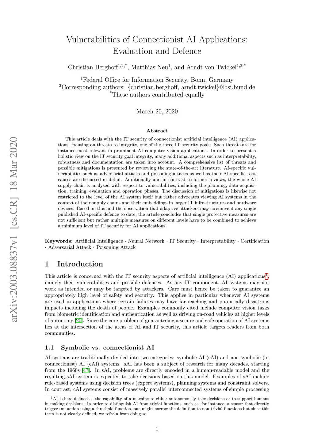Vulnerabilities of Connectionist AI Applications: Evaluation and Defence