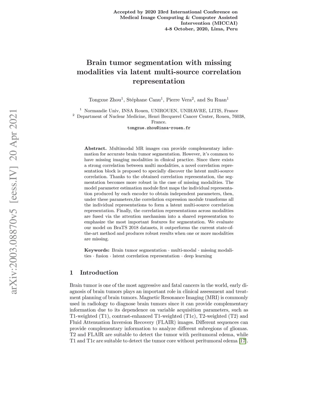 Multimodal MR images can provide complementary information for accurate brain tumor segmentation. However, it's common to have missing imaging modalities in clinical practice. Since there exists a strong correlation between multi modalities, a novel correlation representation block is proposed to specially discover the latent multi-source correlation. Thanks to the obtained correlation representation, the segmentation becomes more robust in the case of missing modalities. The model parameter estimation module first maps the individual representation produced by each encoder to obtain independent parameters, then, under these parameters, the correlation expression module transforms all the individual representations to form a latent multi-source correlation representation. Finally, the correlation representations across modalities are fused via the attention mechanism into a shared representation to emphasize the most important features for segmentation. We evaluate our model on BraTS 2018 datasets, it outperforms the current state-of-the-art method and produces robust results when one or more modalities are missing.