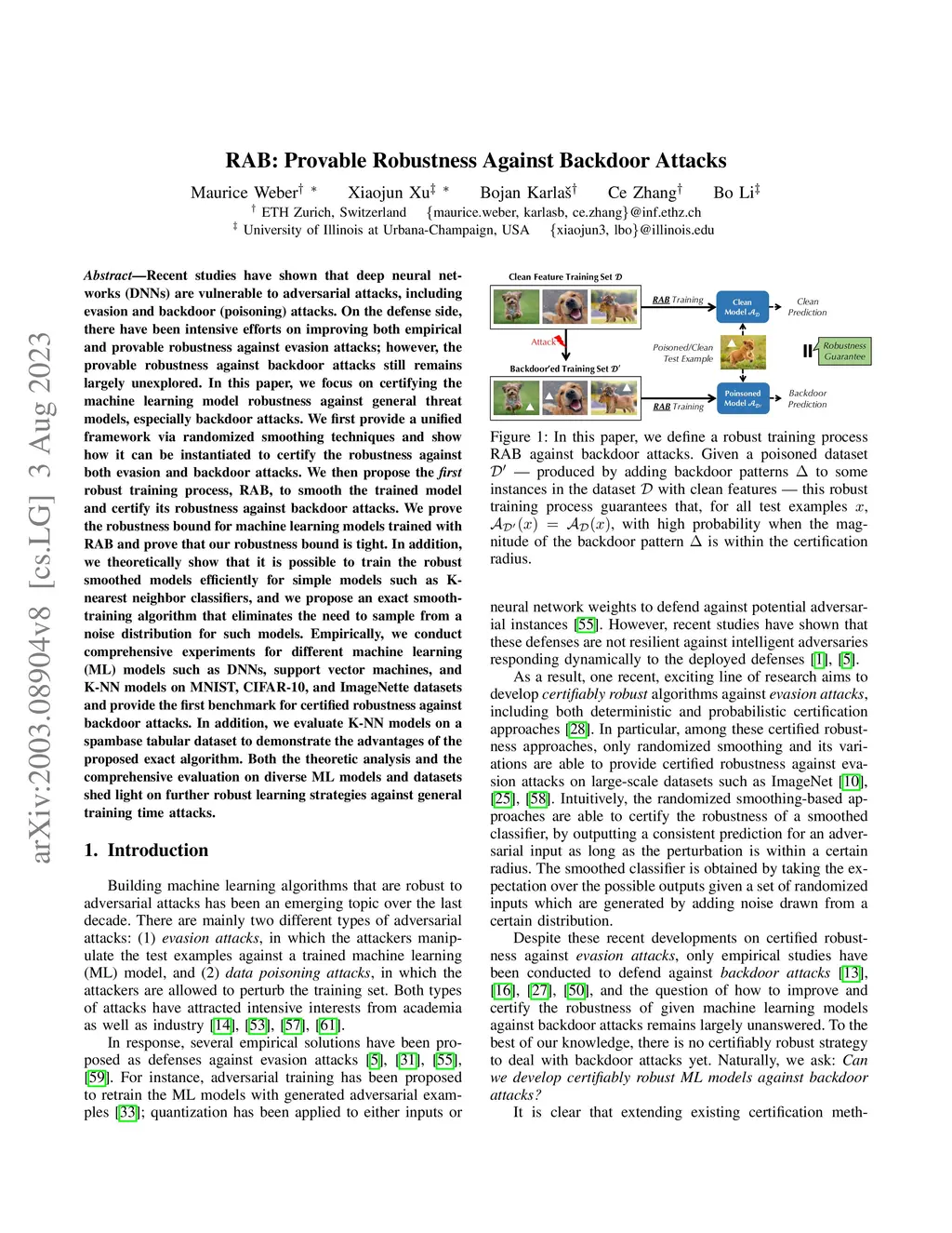 Recent studies have shown that deep neural networks (DNNs) are vulnerable to adversarial attacks, including evasion and backdoor (poisoning) attacks. On the defense side, there have been intensive efforts on improving both empirical and provable robustness against evasion attacks; however, the provable robustness against backdoor attacks still remains largely unexplored. In this paper, we focus on certifying the machine learning model robustness against general threat models, especially backdoor attacks. We first provide a unified framework via randomized smoothing techniques and show how it can be instantiated to certify the robustness against both evasion and backdoor attacks. We then propose the first robust training process, RAB, to smooth the trained model and certify its robustness against backdoor attacks. We prove the robustness bound for machine learning models trained with RAB and prove that our robustness bound is tight. In addition, we theoretically show that it is possible to train the robust smoothed models efficiently for simple models such as K-nearest neighbor classifiers, and we propose an exact smooth-training algorithm that eliminates the need to sample from a noise distribution for such models. Empirically, we conduct comprehensive experiments for different machine learning (ML) models such as DNNs, support vector machines, and K-NN models on MNIST, CIFAR-10, and ImageNette datasets and provide the first benchmark for certified robustness against backdoor attacks. In addition, we evaluate K-NN models on a spambase tabular dataset to demonstrate the advantages of the proposed exact algorithm. Both the theoretic analysis and the comprehensive evaluation on diverse ML models and datasets shed light on further robust learning strategies against general training time attacks.