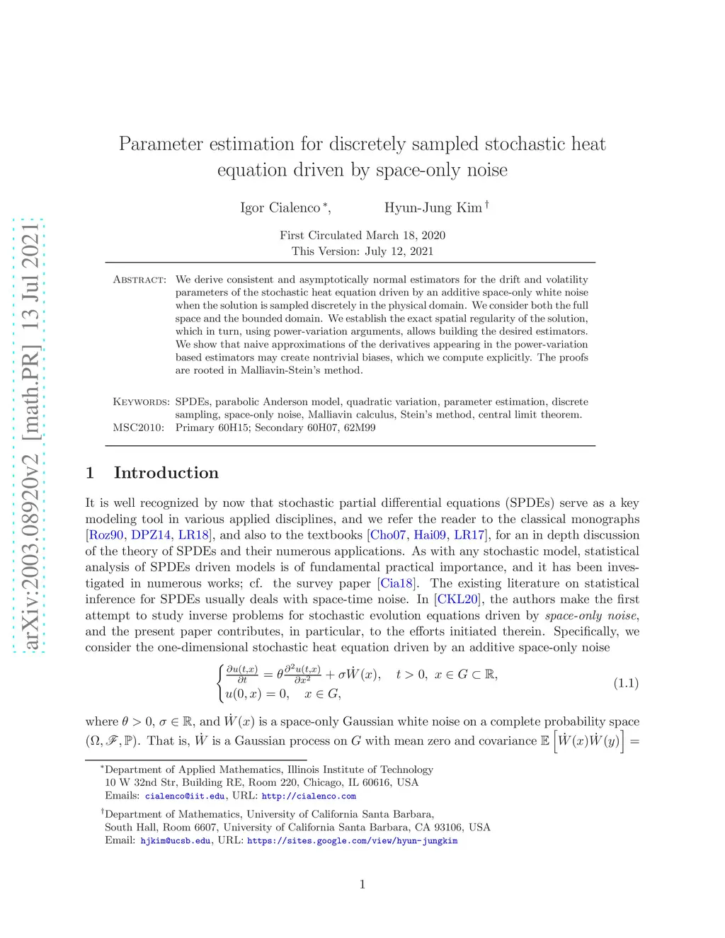 Stochastic Processes and their Applications (SPA), 2020