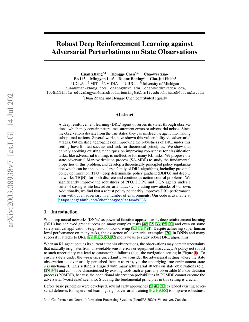A deep reinforcement learning (DRL) agent observes its states through observations, which may contain natural measurement errors or adversarial noises. Since the observations deviate from the true states, they can mislead the agent into making suboptimal actions. Several works have shown this vulnerability via adversarial attacks, but existing approaches on improving the robustness of DRL under this setting have limited success and lack for theoretical principles. We show that naively applying existing techniques on improving robustness for classification tasks, like adversarial training, is ineffective for many RL tasks. We propose the state-adversarial Markov decision process (SA-MDP) to study the fundamental properties of this problem, and develop a theoretically principled policy regularization which can be applied to a large family of DRL algorithms, including proximal policy optimization (PPO), deep deterministic policy gradient (DDPG) and deep Q networks (DQN), for both discrete and continuous action control problems. We significantly improve the robustness of PPO, DDPG and DQN agents under a suite of strong white box adversarial attacks, including new attacks of our own. Additionally, we find that a robust policy noticeably improves DRL performance even without an adversary in a number of environments. Our code is available at https://github.com/chenhongge/StateAdvDRL.