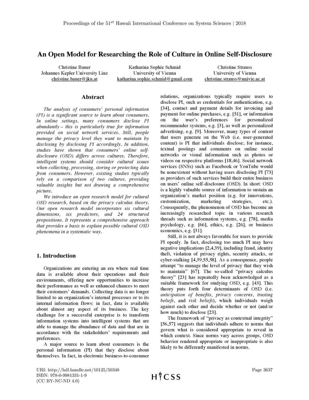 The analysis of consumers' personal information (PI) is a significant source to learn about consumers. In online settings, many consumers disclose PI abundantly -- this is particularly true for information provided on social network services. Still, people manage the privacy level they want to maintain by disclosing by disclosing PI accordingly. In addition, studies have shown that consumers' online self-disclosure (OSD) differs across cultures. Therefore, intelligent systems should consider cultural issues when collecting, processing, storing or protecting data from consumers. However, existing studies typically rely on a comparison of two cultures, providing valuable insights but not drawing a comprehensive picture. We introduce an open research model for cultural OSD research, based on the privacy calculus theory. Our open research model incorporates six cultural dimensions, six predictors, and 24 structured propositions. It represents a comprehensive approach that provides a basis to explain possible cultural OSD phenomena in a systematic way.