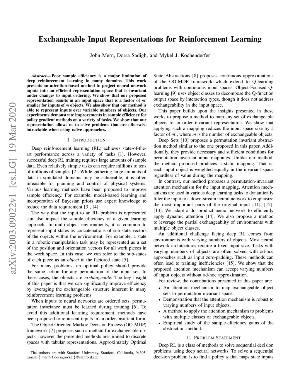 Poor sample efficiency is a major limitation of deep reinforcement learning in many domains. This work presents an attention-based method to project neural network inputs into an efficient representation space that is invariant under changes to input ordering. We show that our proposed representation results in an input space that is a factor of smaller for inputs of objects. We also show that our method is able to represent inputs over variable numbers of objects. Our experiments demonstrate improvements in sample efficiency for policy gradient methods on a variety of tasks. We show that our representation allows us to solve problems that are otherwise intractable when using na\"ive approaches.