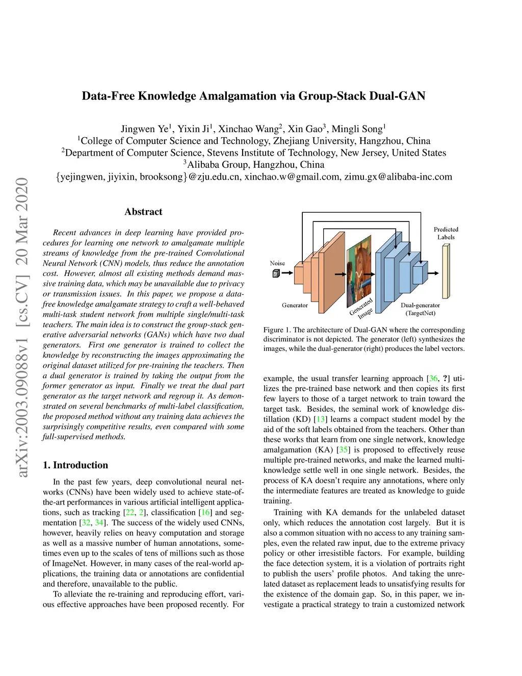 Recent advances in deep learning have provided procedures for learning one network to amalgamate multiple streams of knowledge from the pre-trained Convolutional Neural Network (CNN) models, thus reduce the annotation cost. However, almost all existing methods demand massive training data, which may be unavailable due to privacy or transmission issues. In this paper, we propose a data-free knowledge amalgamate strategy to craft a well-behaved multi-task student network from multiple single/multi-task teachers. The main idea is to construct the group-stack generative adversarial networks (GANs) which have two dual generators. First one generator is trained to collect the knowledge by reconstructing the images approximating the original dataset utilized for pre-training the teachers. Then a dual generator is trained by taking the output from the former generator as input. Finally we treat the dual part generator as the target network and regroup it. As demonstrated on several benchmarks of multi-label classification, the proposed method without any training data achieves the surprisingly competitive results, even compared with some full-supervised methods.