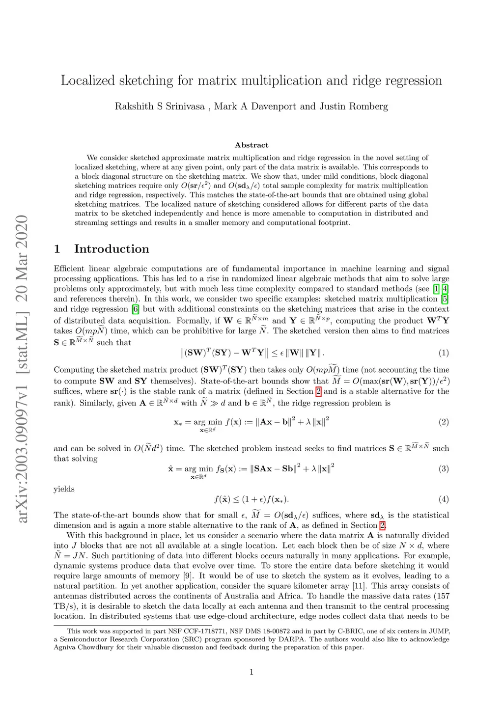 We consider sketched approximate matrix multiplication and ridge regression in the novel setting of localized sketching, where at any given point, only part of the data matrix is available. This corresponds to a block diagonal structure on the sketching matrix. We show that, under mild conditions, block diagonal sketching matrices require only O(stable rank / \epsilon^2) and total sample complexity for matrix multiplication and ridge regression, respectively. This matches the state-of-the-art bounds that are obtained using global sketching matrices. The localized nature of sketching considered allows for different parts of the data matrix to be sketched independently and hence is more amenable to computation in distributed and streaming settings and results in a smaller memory and computational footprint.