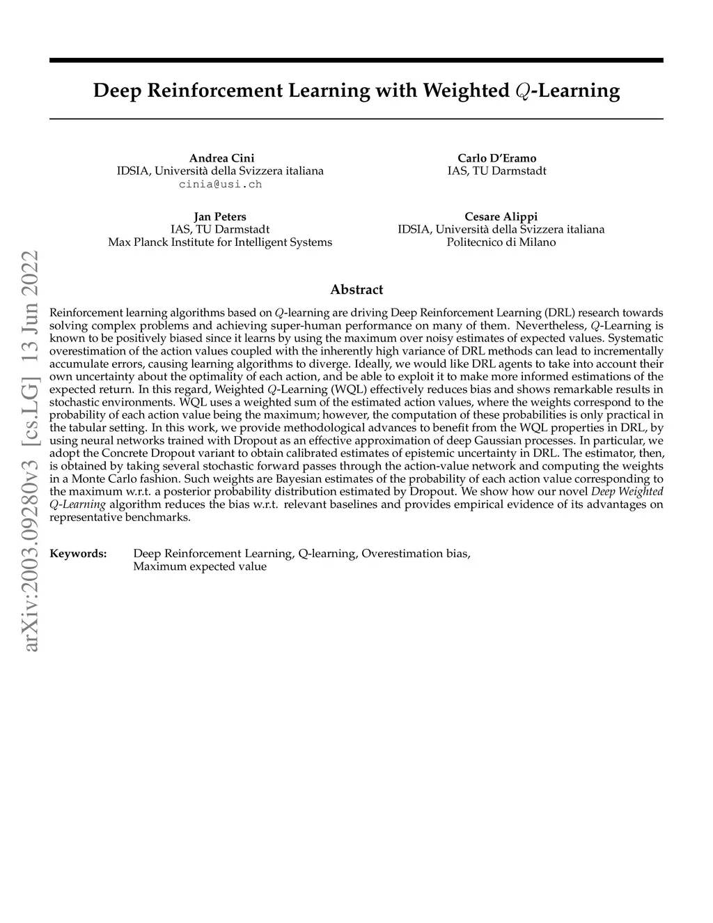 Reinforcement learning algorithms based on Q-learning are driving Deep Reinforcement Learning (DRL) research towards solving complex problems and achieving super-human performance on many of them. Nevertheless, Q-Learning is known to be positively biased since it learns by using the maximum over noisy estimates of expected values. Systematic overestimation of the action values coupled with the inherently high variance of DRL methods can lead to incrementally accumulate errors, causing learning algorithms to diverge. Ideally, we would like DRL agents to take into account their own uncertainty about the optimality of each action, and be able to exploit it to make more informed estimations of the expected return. In this regard, Weighted Q-Learning (WQL) effectively reduces bias and shows remarkable results in stochastic environments. WQL uses a weighted sum of the estimated action values, where the weights correspond to the probability of each action value being the maximum; however, the computation of these probabilities is only practical in the tabular setting. In this work, we provide methodological advances to benefit from the WQL properties in DRL, by using neural networks trained with Dropout as an effective approximation of deep Gaussian processes. In particular, we adopt the Concrete Dropout variant to obtain calibrated estimates of epistemic uncertainty in DRL. The estimator, then, is obtained by taking several stochastic forward passes through the action-value network and computing the weights in a Monte Carlo fashion. Such weights are Bayesian estimates of the probability of each action value corresponding to the maximum w.r.t. a posterior probability distribution estimated by Dropout. We show how our novel Deep Weighted Q-Learning algorithm reduces the bias w.r.t. relevant baselines and provides empirical evidence of its advantages on representative benchmarks.