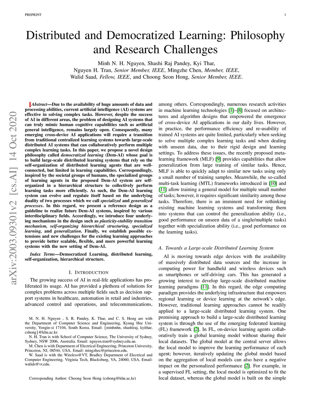 Due to the availability of huge amounts of data and processing abilities, current artificial intelligence (AI) systems are effective in solving complex tasks. However, despite the success of AI in different areas, the problem of designing AI systems that can truly mimic human cognitive capabilities such as artificial general intelligence, remains largely open. Consequently, many emerging cross-device AI applications will require a transition from traditional centralized learning systems towards large-scale distributed AI systems that can collaboratively perform multiple complex learning tasks. In this paper, we propose a novel design philosophy called democratized learning (Dem-AI) whose goal is to build large-scale distributed learning systems that rely on the self-organization of distributed learning agents that are well-connected, but limited in learning capabilities. Correspondingly, inspired by the societal groups of humans, the specialized groups of learning agents in the proposed Dem-AI system are self-organized in a hierarchical structure to collectively perform learning tasks more efficiently. As such, the Dem-AI learning system can evolve and regulate itself based on the underlying duality of two processes which we call specialized and generalized processes. In this regard, we present a reference design as a guideline to realize future Dem-AI systems, inspired by various interdisciplinary fields. Accordingly, we introduce four underlying mechanisms in the design such as plasticity-stability transition mechanism, self-organizing hierarchical structuring, specialized learning, and generalization. Finally, we establish possible extensions and new challenges for the existing learning approaches to provide better scalable, flexible, and more powerful learning systems with the new setting of Dem-AI.