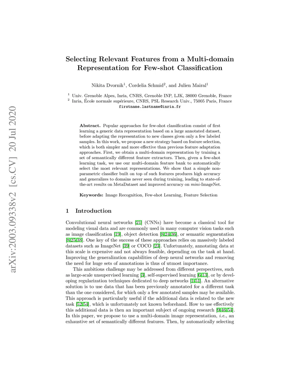 Popular approaches for few-shot classification consist of first learning a generic data representation based on a large annotated dataset, before adapting the representation to new classes given only a few labeled samples. In this work, we propose a new strategy based on feature selection, which is both simpler and more effective than previous feature adaptation approaches. First, we obtain a multi-domain representation by training a set of semantically different feature extractors. Then, given a few-shot learning task, we use our multi-domain feature bank to automatically select the most relevant representations. We show that a simple non-parametric classifier built on top of such features produces high accuracy and generalizes to domains never seen during training, which leads to state-of-the-art results on MetaDataset and improved accuracy on mini-ImageNet.